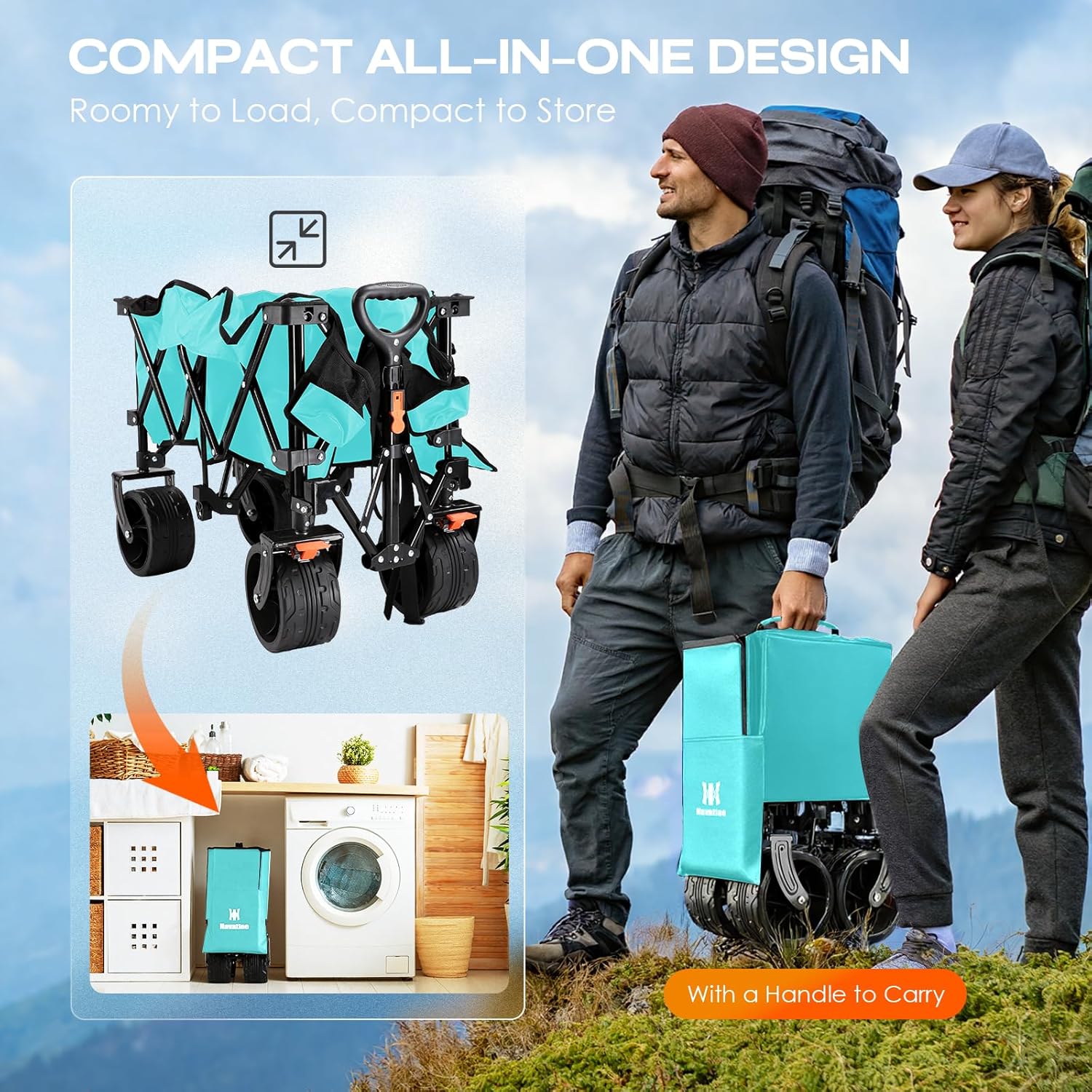 - EXCELLENT ADDITIONAL PERFORMANCE : Our side pocket will give you way additional storage capacity than other wagons. You can put the umbrella or camping gear in it. It has two mesh cup holders to keep your drinks upright during transport. The ergonomic shape of the handle is for easier pulling and hauling to reduce labor that allows for smooth control. Our great value wagons are sure to serve you for many years and make your companion in your outdoor life.