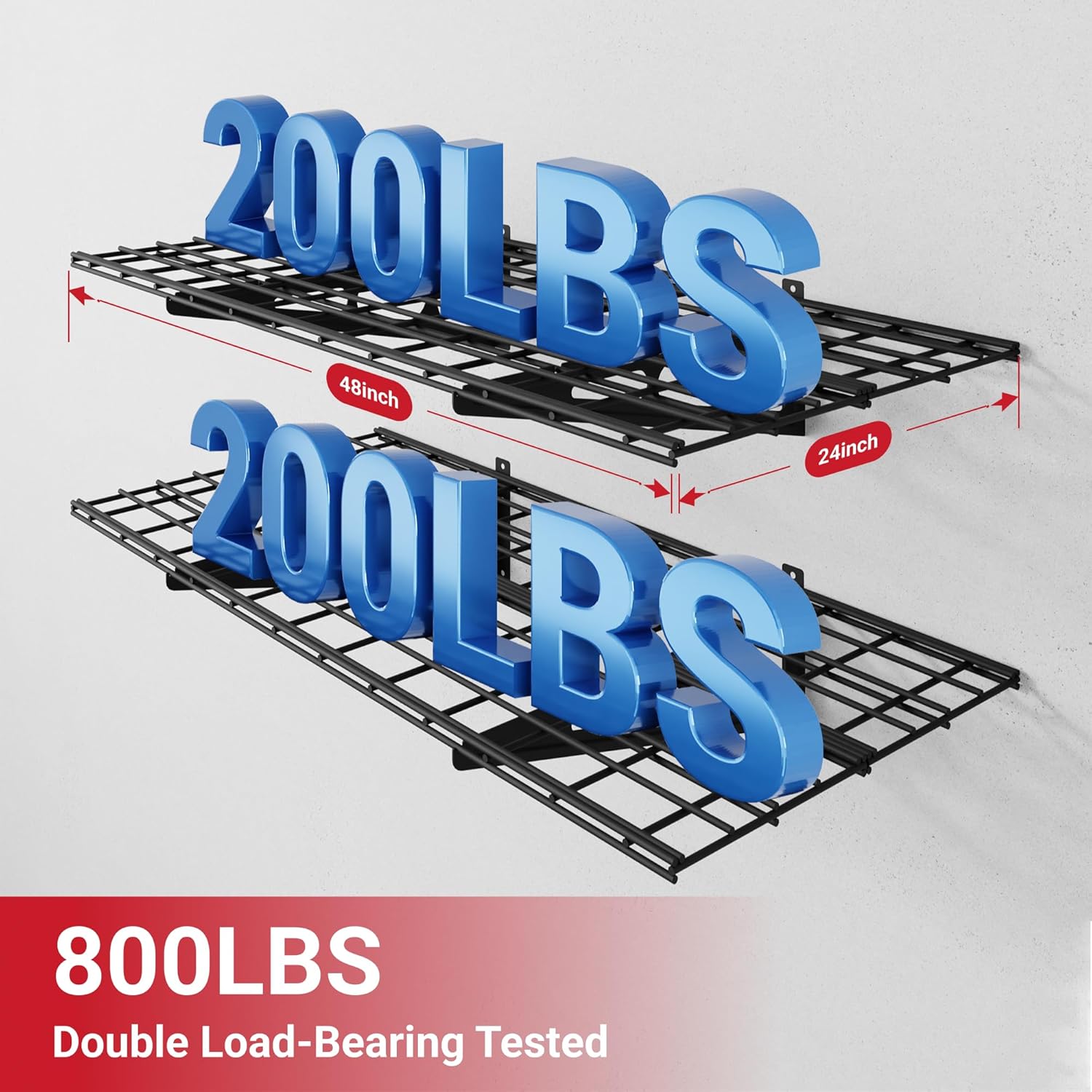 - High Load Capacity: The shelving can safely hold a total load of 400 lbs (200 lbs per tier). Each hook can safely hold 50 lbs.
