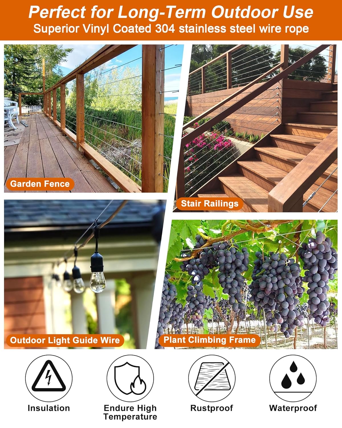 - [Durable and Rust-Resistant] Crafted from superior quality 304 stainless steel, our string light hanging kit boasts exceptional corrosion resistance, durability and bearing capacity, perfect for indoor and outdoor multi-purpose use. The 1/8" stainless steel wire cable features a 7X7 strand core structure that ensures strength and safety on all occasions. While the vinyl coating provides a smooth and insulated surface, preventing rust and providing a longer lifespan than nylon coating