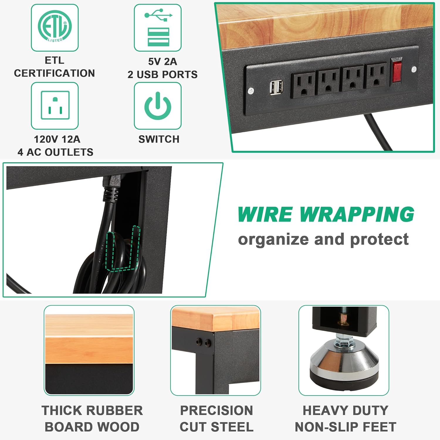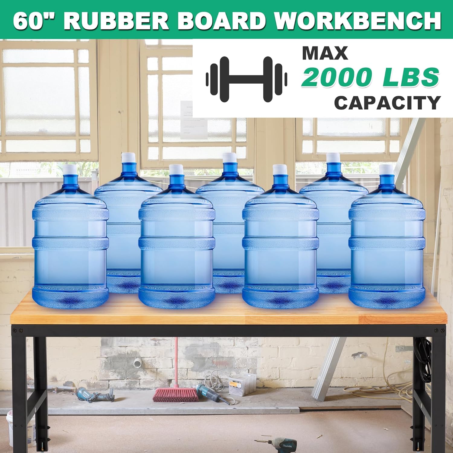 HABUTWAY Height Adjustable Workbench, 60"x20" 2000 Lbs Capacity Solid Wood Work Station Heavy-Duty, with Power Outlets, for Garage Party Shop Office