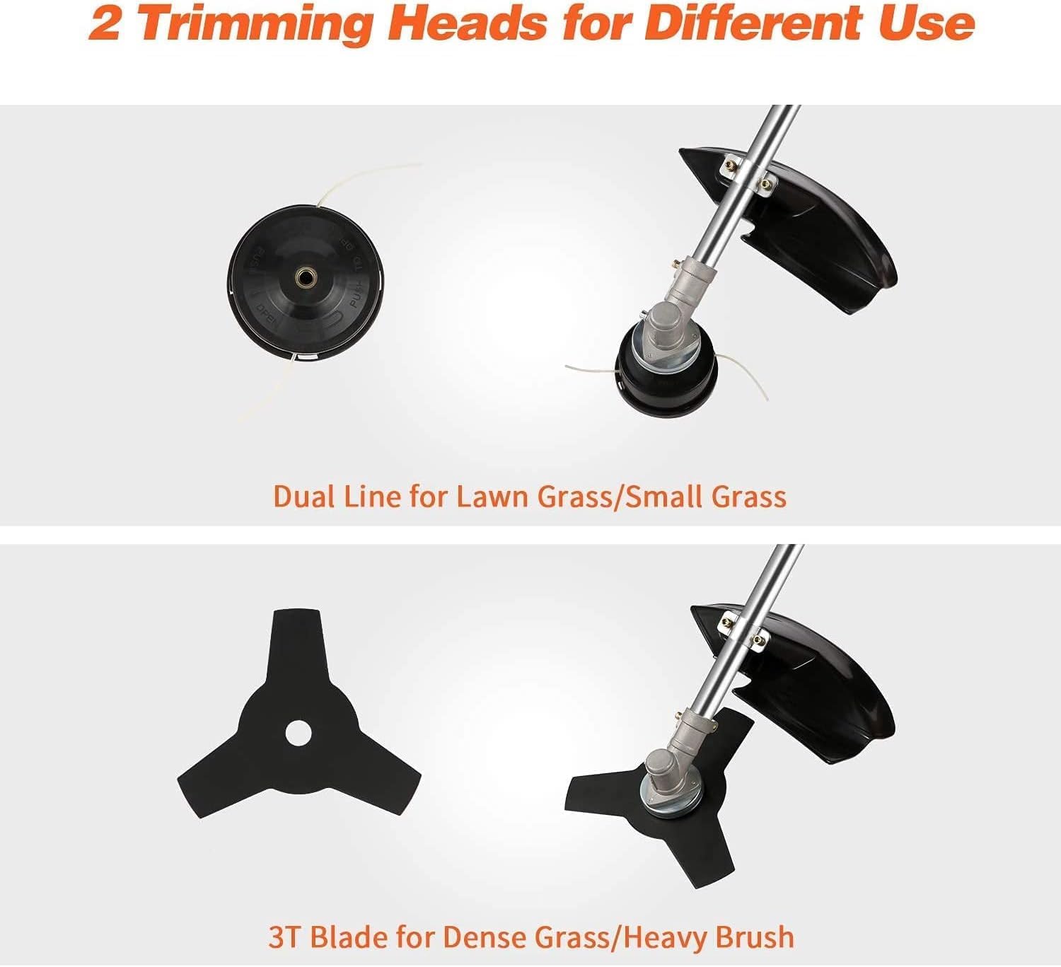 - 🍀2-In-1 Detachable Trimming Heads --- Brush cutter equipped with 2 trimming heads, easily convert from 4T blade to 3T blade or dual thread head. 0.08" dual line head is intended to cut lawn & tender grass; 3T blade/saw blade brush cutter to power through weed and small shrub vegetation or withered grass, ect.