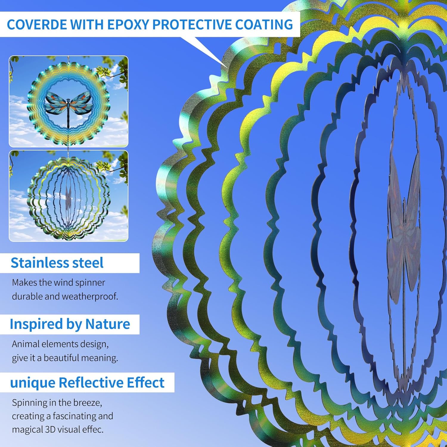 - 12inch 3D Dragonfly Wind Spinner Outdoor Decor - Cawalap Dragonfly Metal Wind Spinner is made from Sturdy stainless steel material by laser-cutting technology to form vivid shape, makes it flexible and strong, is individually hand painted by epoxy protective coating with colorful sparkle powder inside to highly resist weather and rust. a frosted paint finish, giving off a sparkling when it spin. The unique design combined meaningful animal pattern and a 3D streamer effect.