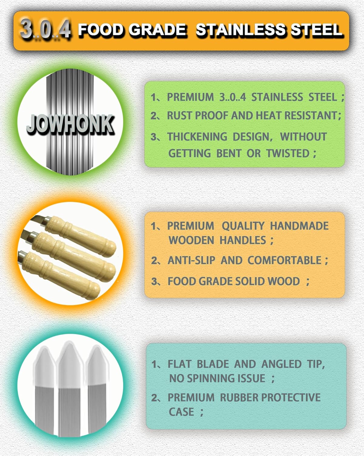 - 【FOOD GRADE 304 STAINLESS STEEL】JOWHONK BBQ skewers for grilling are 23.5 inches long,0.4 in width,0.07 in thickness. Our wooden handle flat metal skewers for kabobs are made of premium 304 stainless steel, Ensuring non-rust long time durability, Heat resistant and non-poisonous,Harder than other stainless steel and iron.It's safety for children.Our Stainless steel Barbecue skewers are reusable. The BBQ kabob skewers surface is smooth that grilled food residue won't get stuck onto the kabob skewer blade.