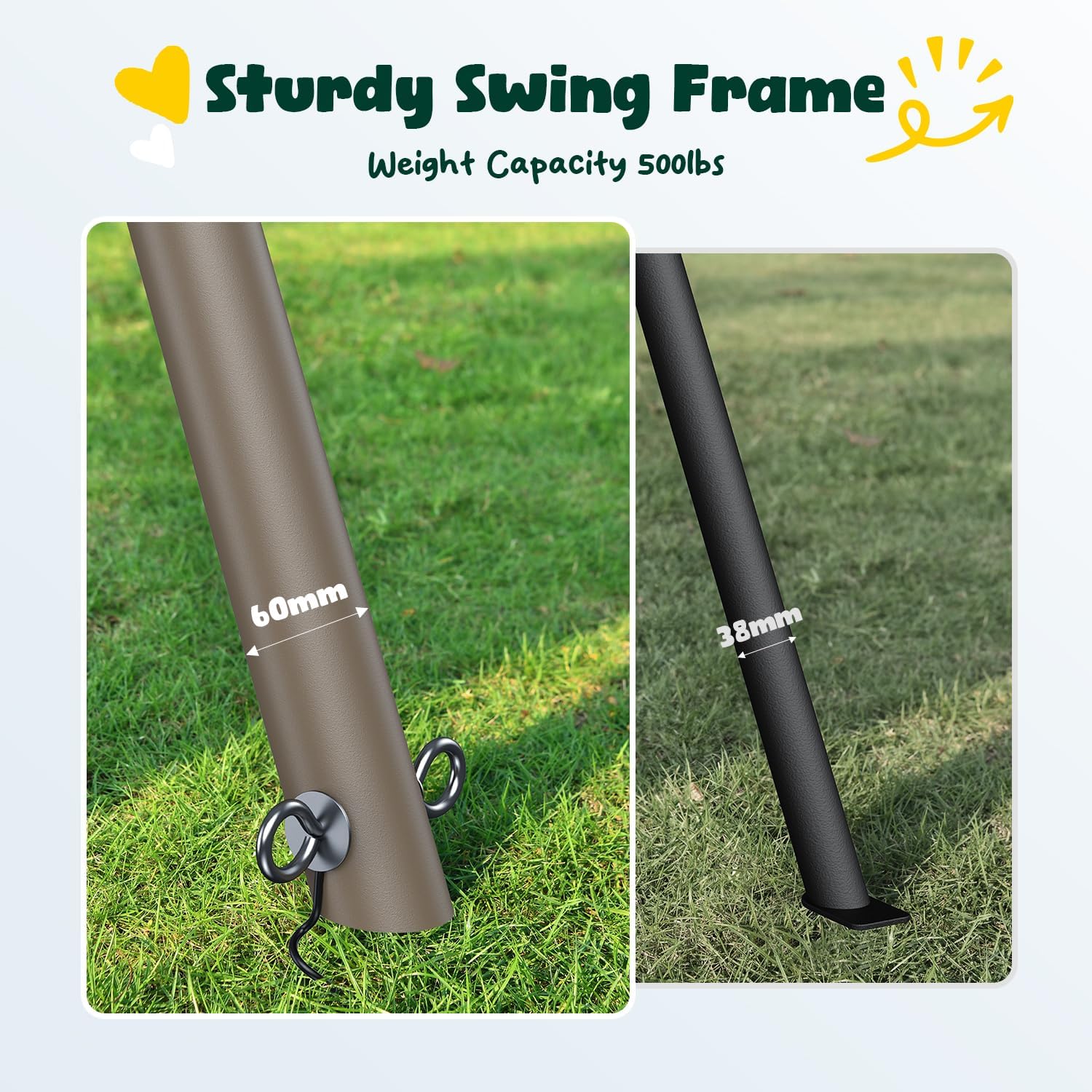 - ăHeavy Duty Outdoor PlaysetăHapfan's kids' swingset features a robust A-frame design and durable 60mm-diameter metal poles for enhanced stability. The outdoor swing set can support up to 500lbs, ensuring safety for all users