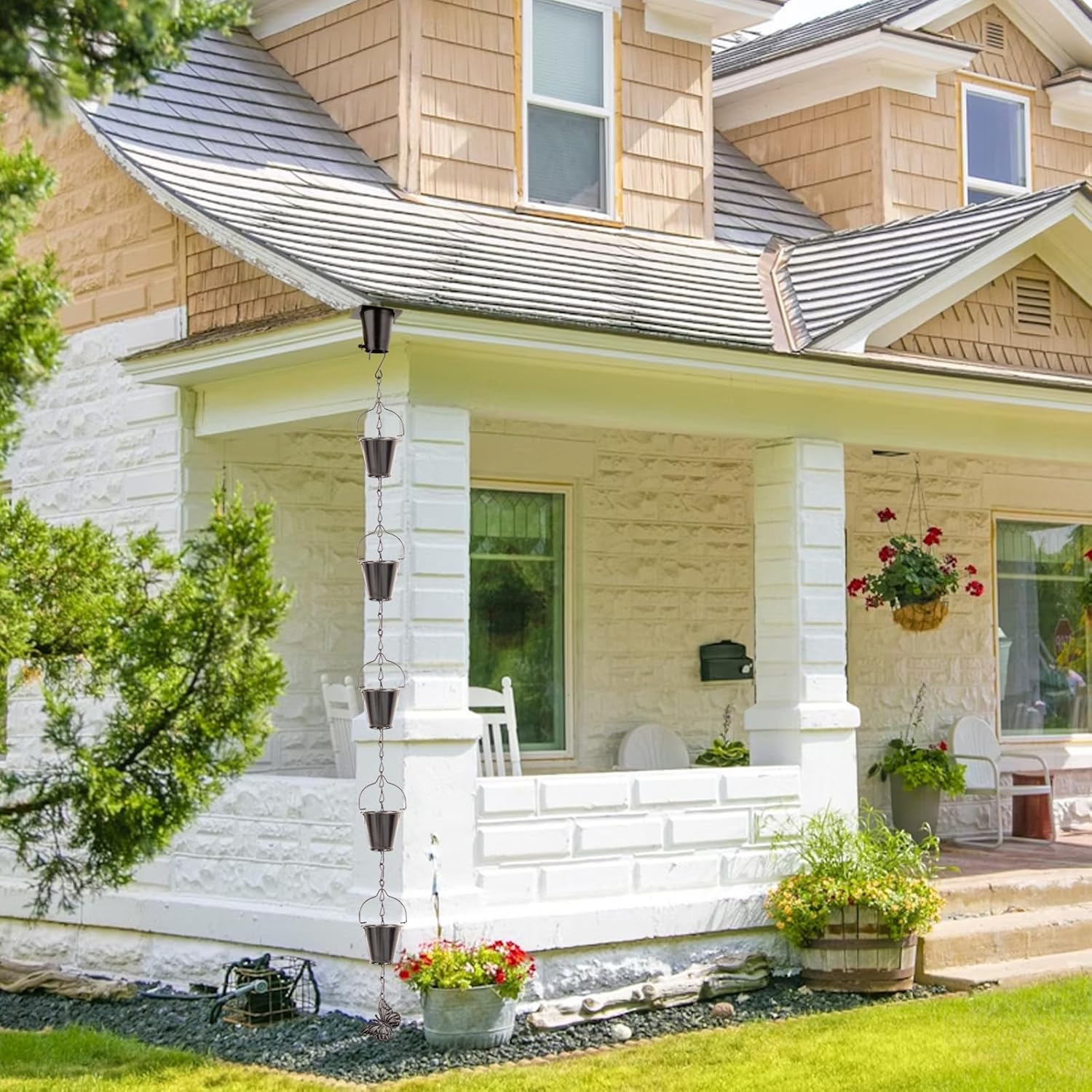 - PREMIUM QUALITY MATERIAL: The rain catcher is made of durable iron material to ensure stability and durability in all weather conditions. Whether it's direct sunlight or rain, this rain catcher chain will stand up to the elements and won't fade or break over time.