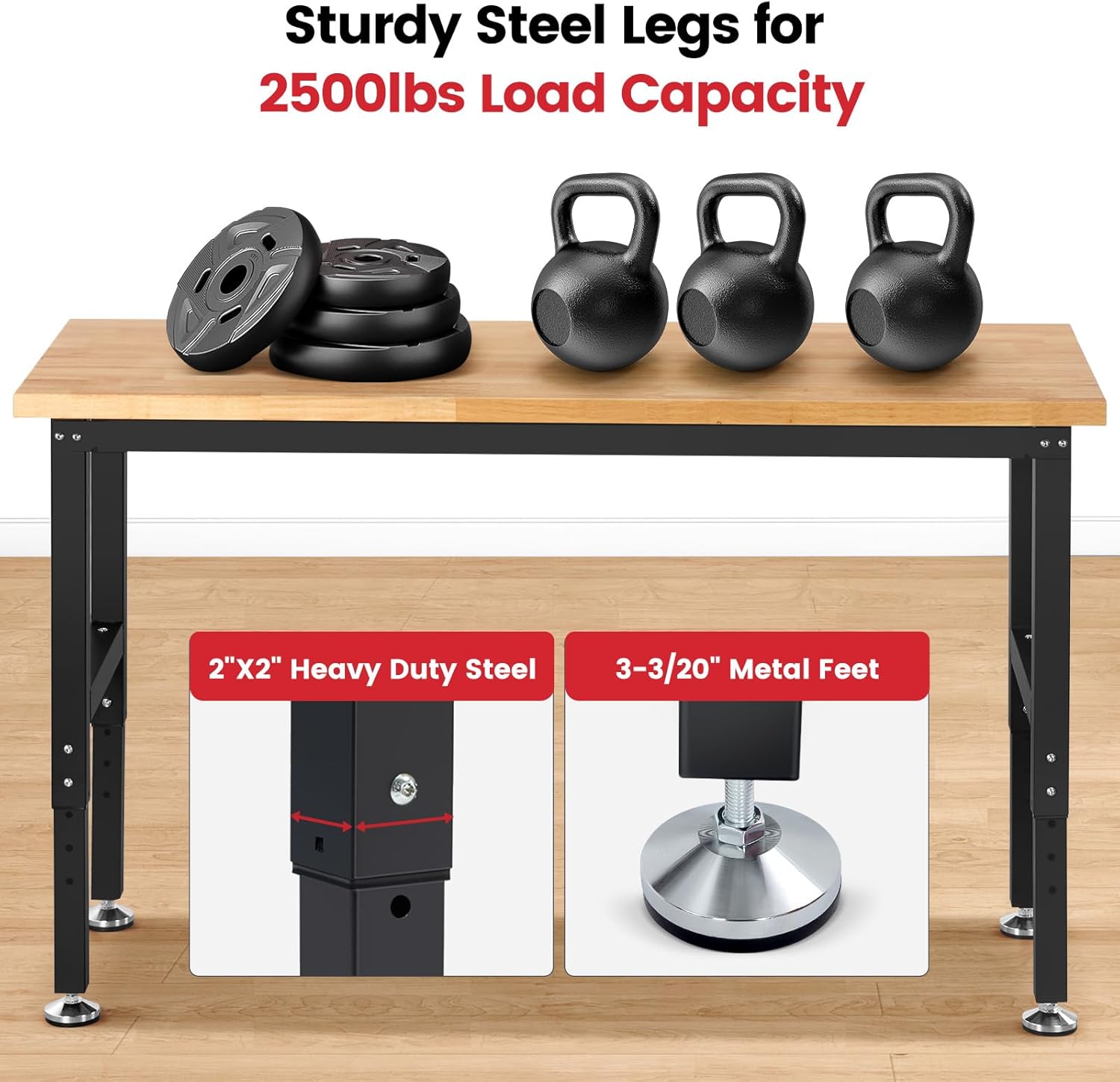 - Heavy Duty Rubberwood Tabletop: 1.2" solid rubberwood tabletop, with a weight capacity of 2500LBS, suits for heavy tools and materials. Comes with an safety varnish to protect the wood,workbench last longer.