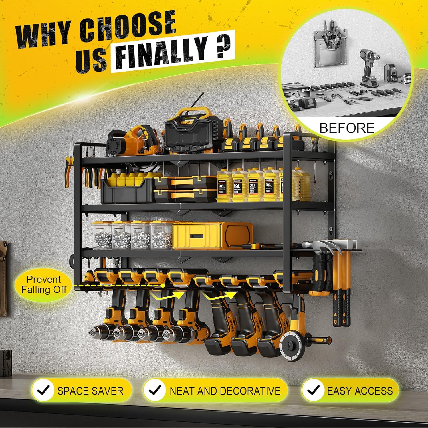 - Heavy Duty Steel Construction: The power tool organizer is constructed from a high quality powder-coated alloy steel, Its sleek black finish prevents scratching, that is rust-resistant, corrosion-resistant, and scratch-resistant.