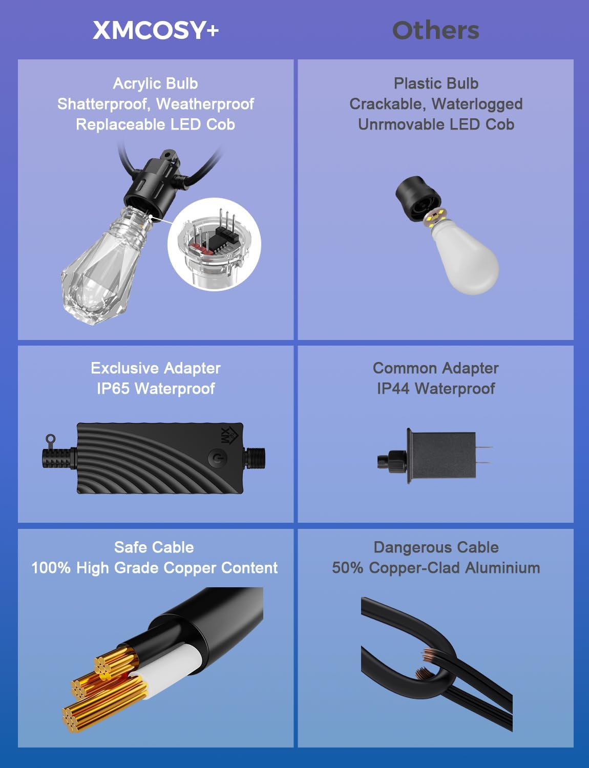 - Brighter and Longer: XMcosy smart string lights can be expended up to 196 feet(65 bulbs) with a single adapter, easily cover large spaces. With upgraded replaceable LED panels to provide brighter multicolor lighting while adding more flexibility.