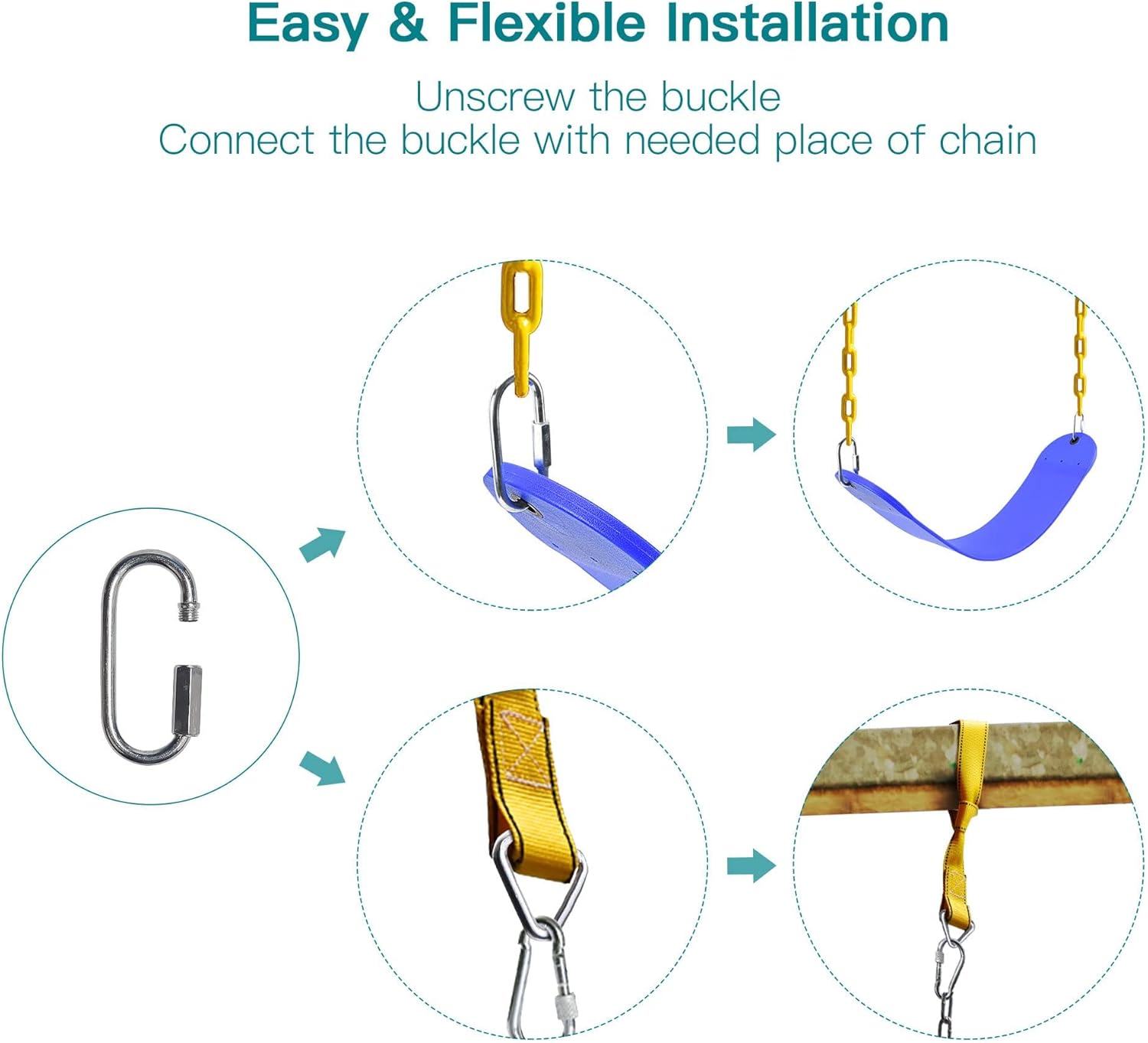 - 【Easy Installation & More Flexible Design】Our swing seats with chains provide extra locking buckles that are made of premium steel, which are steady and durable. The material solves the problem of rust on product surface. You can connect the buckle with the chain in the needed link, which makes the hanging installation more flexible. Unlike other kids swings' plastic plate connection buckle, our child swing seat connects with locking buckle that can easily take down for convenience.