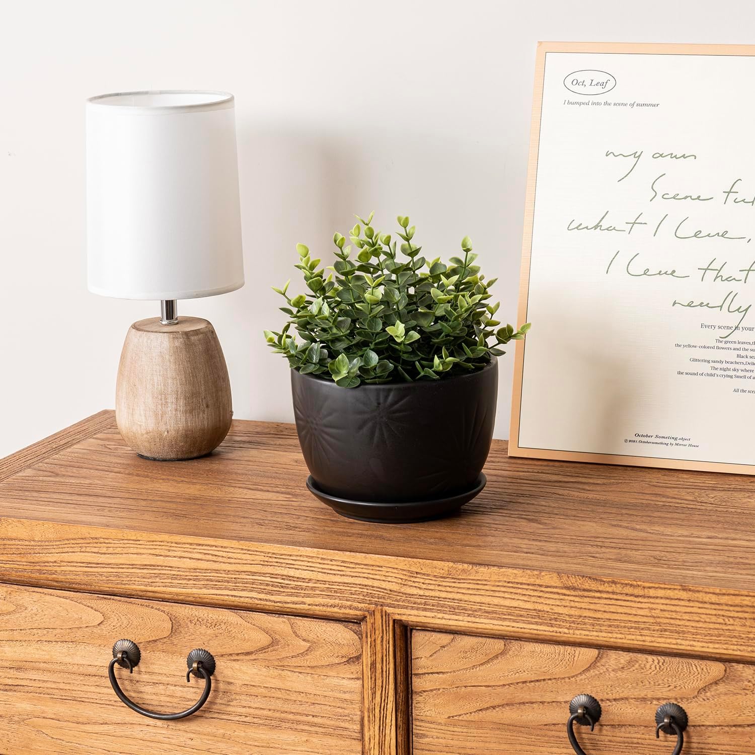 - Modern matte black ceramic empty pot with embossed sunburst design, drainage hole and attached saucer dish provides a sophisticated home for any houseplant