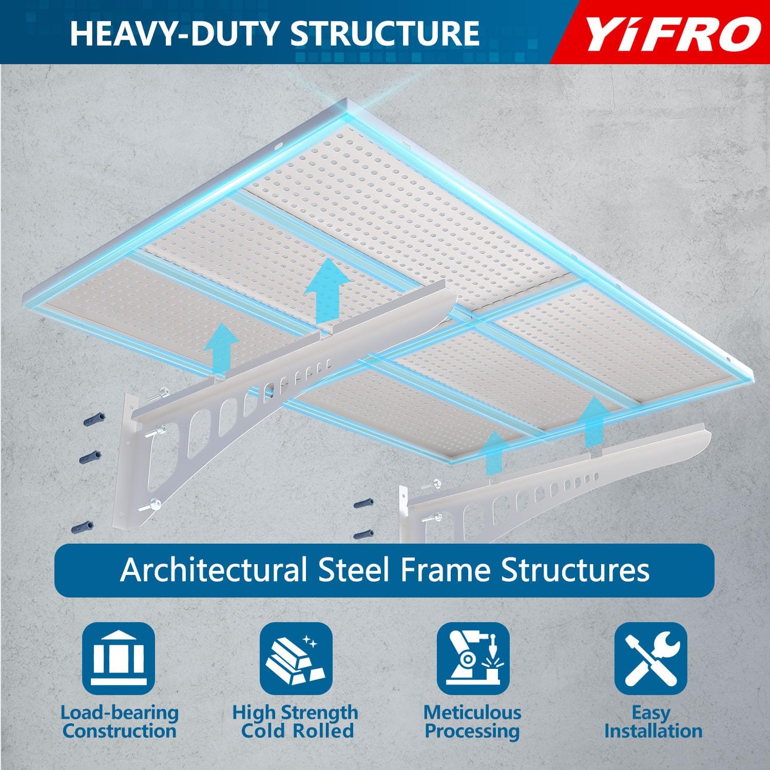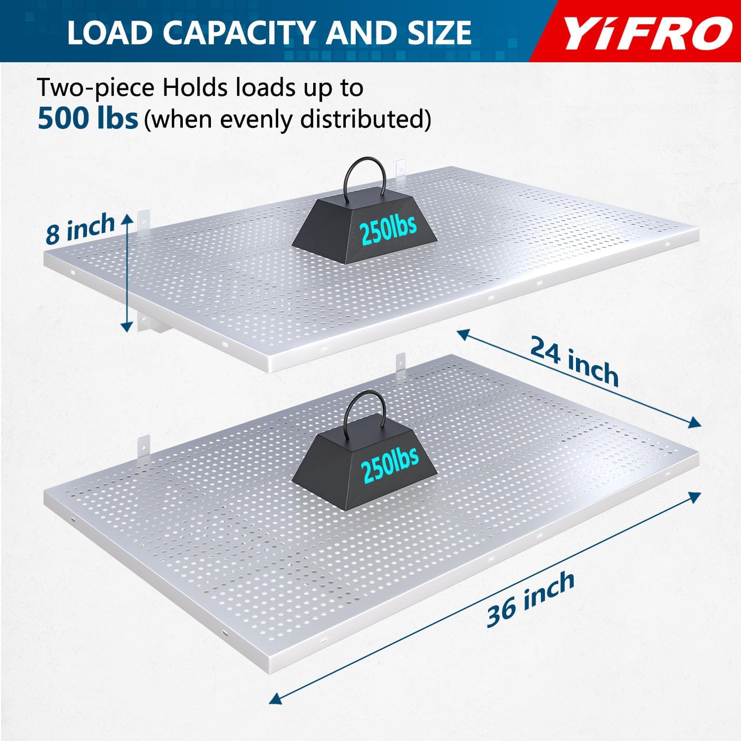 - HEAVY DUTY CONSTRUCTION: YIFRO garage wall shelving takes its cues from architectural frame construction, with a 2x3 ft individual bracket load capacity of 250 lbs. and a total of 500 lbs. for 2 shelves, which makes it easy to store most of the items in your garage.