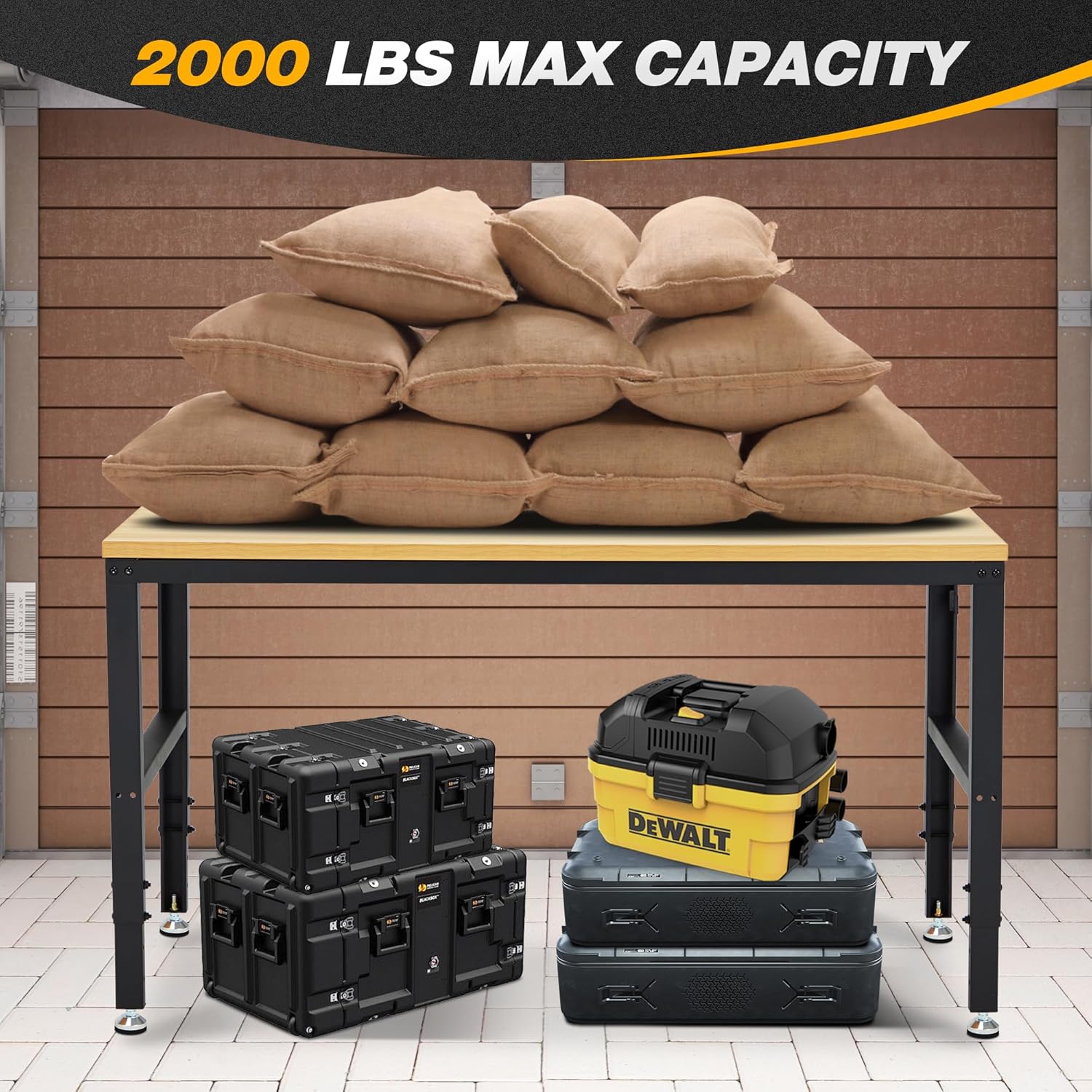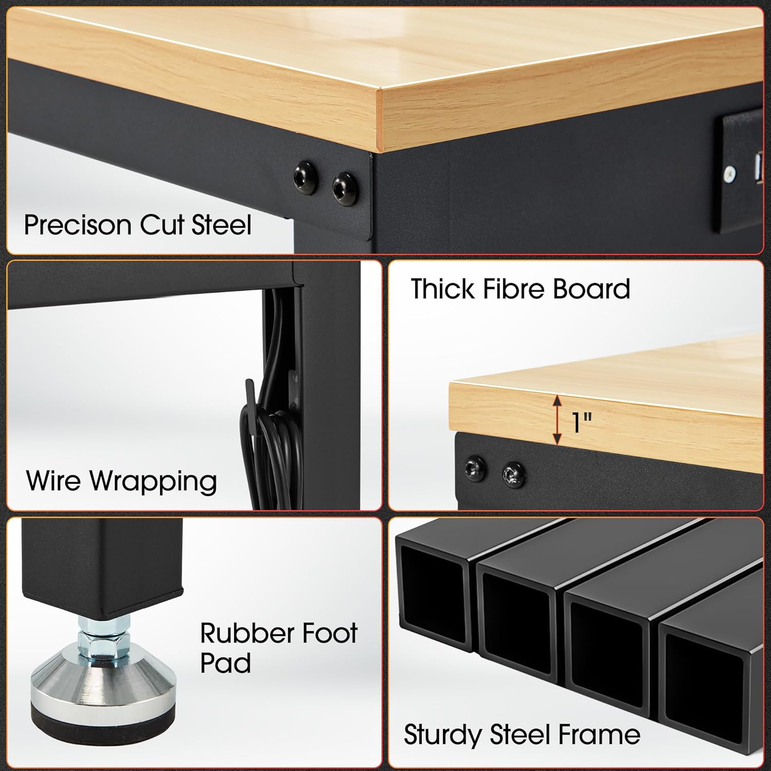 - Heavy Duty Work Bench: Constructed of high quality materials, the workbench consists of a 1" thick wood board tabletop and black textured steel frame that withstands powerful impacts up to 2000 lbs