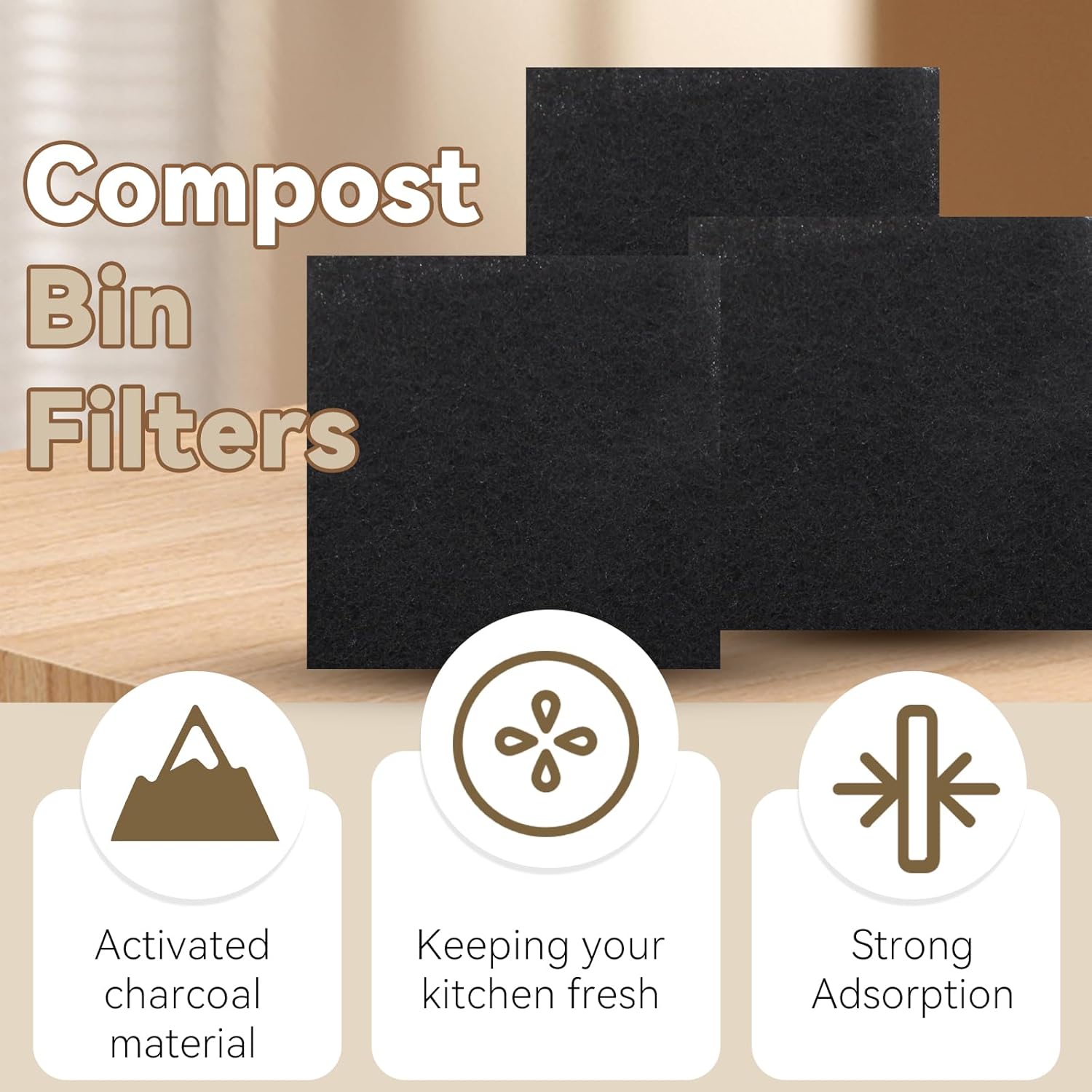 - Preferred Material: The charcoal filters for kitchen is made of activated carbon, which can effectively absorb the smells of the compost bin and prevent food smells from escaping from the compost bin