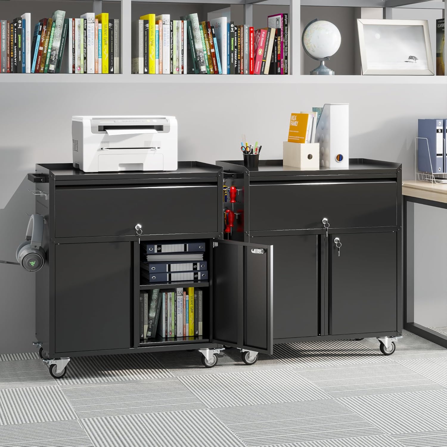 35.43'' H Metal Storage Cabinet on Wheels with 1 Drawer, Rolling Steel Garage Tools Cabinet with Side Pegboard &4 Hooks & 1 Adjustable Shelf for Garage,Shop,Home, Black, Assembly Required