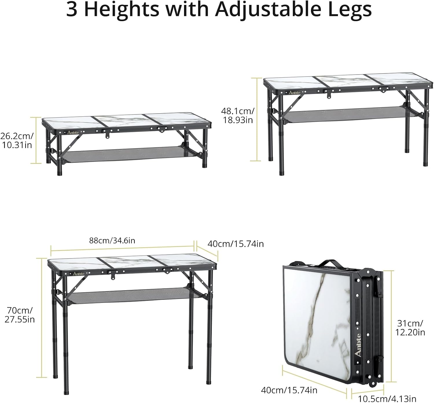 - Note: 1. Gently press the table top in the middle to make sure it is flat. 2. The dimensions of our camping tables are all measured by hand, so please allow an error of about 1 cm. Thank you for your understanding. 3. This product adjusts the height by inserting and pulling out the leg, please use it in a flat place