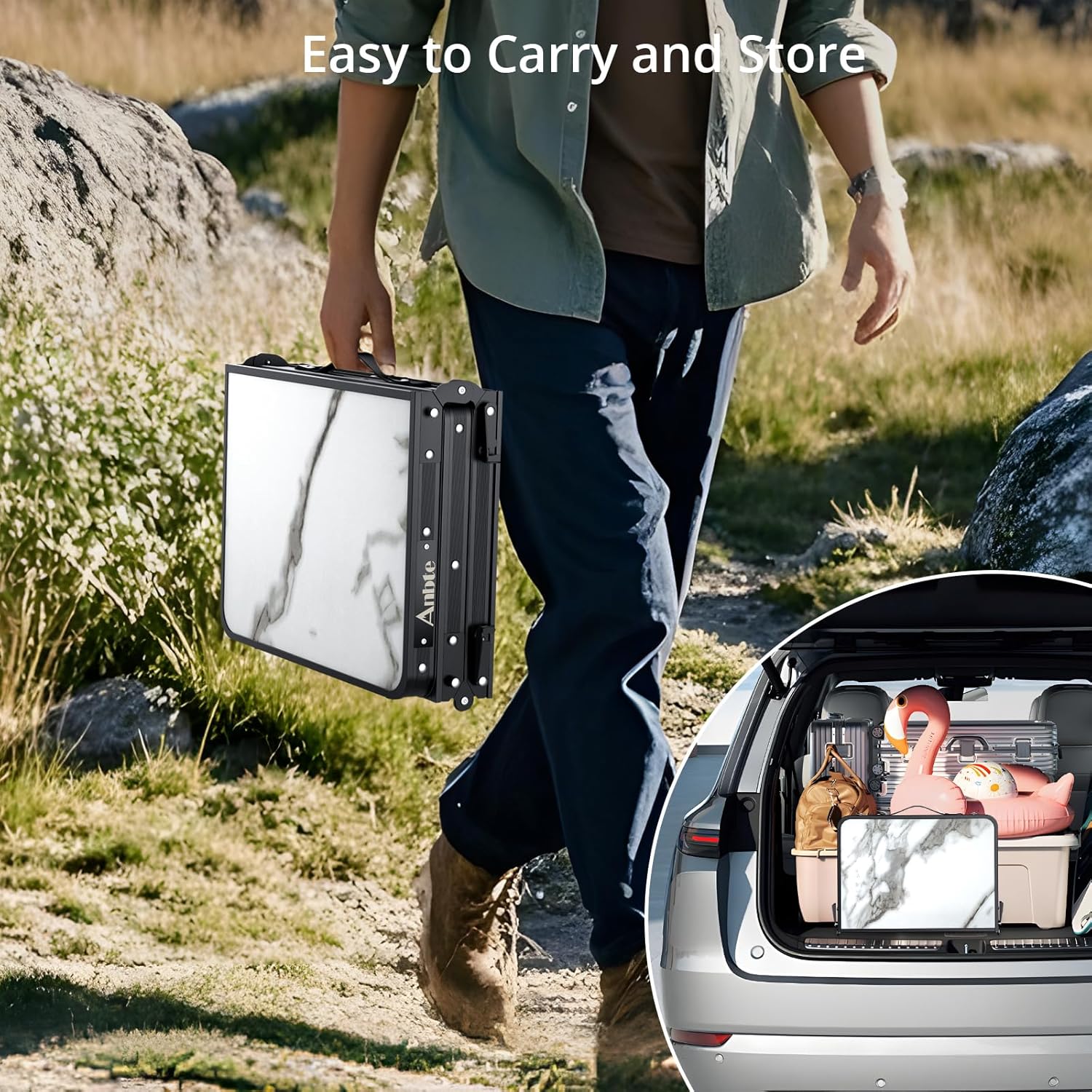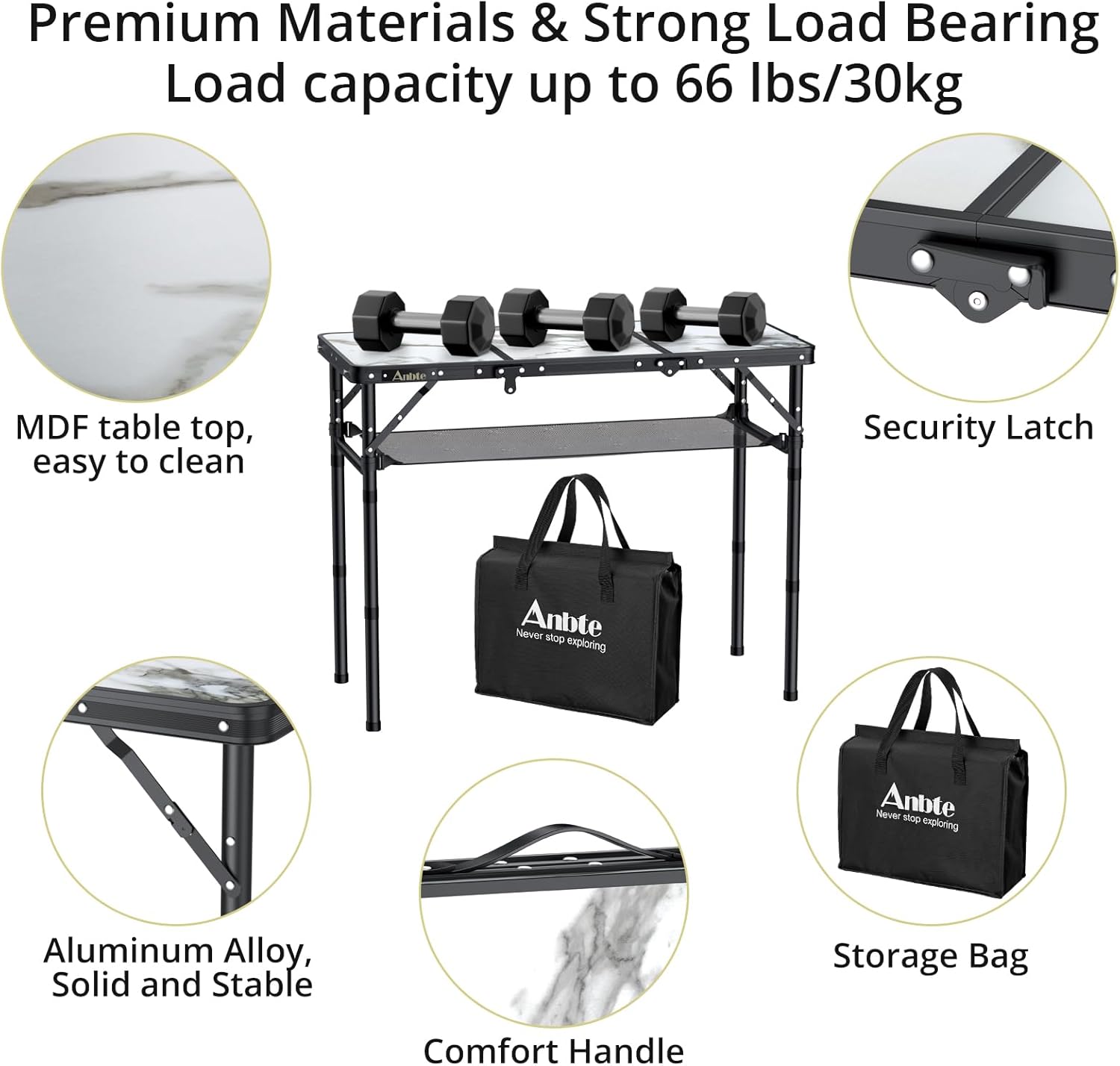 - ăPremium Quality Materials, Strong Load-Bearingă Anbte portable folding table's frame is made of thickened aluminum alloy and can hold up to 66 pounds, making it extremely stable. It comes with a U-shaped frame and buckles for added stability and durability