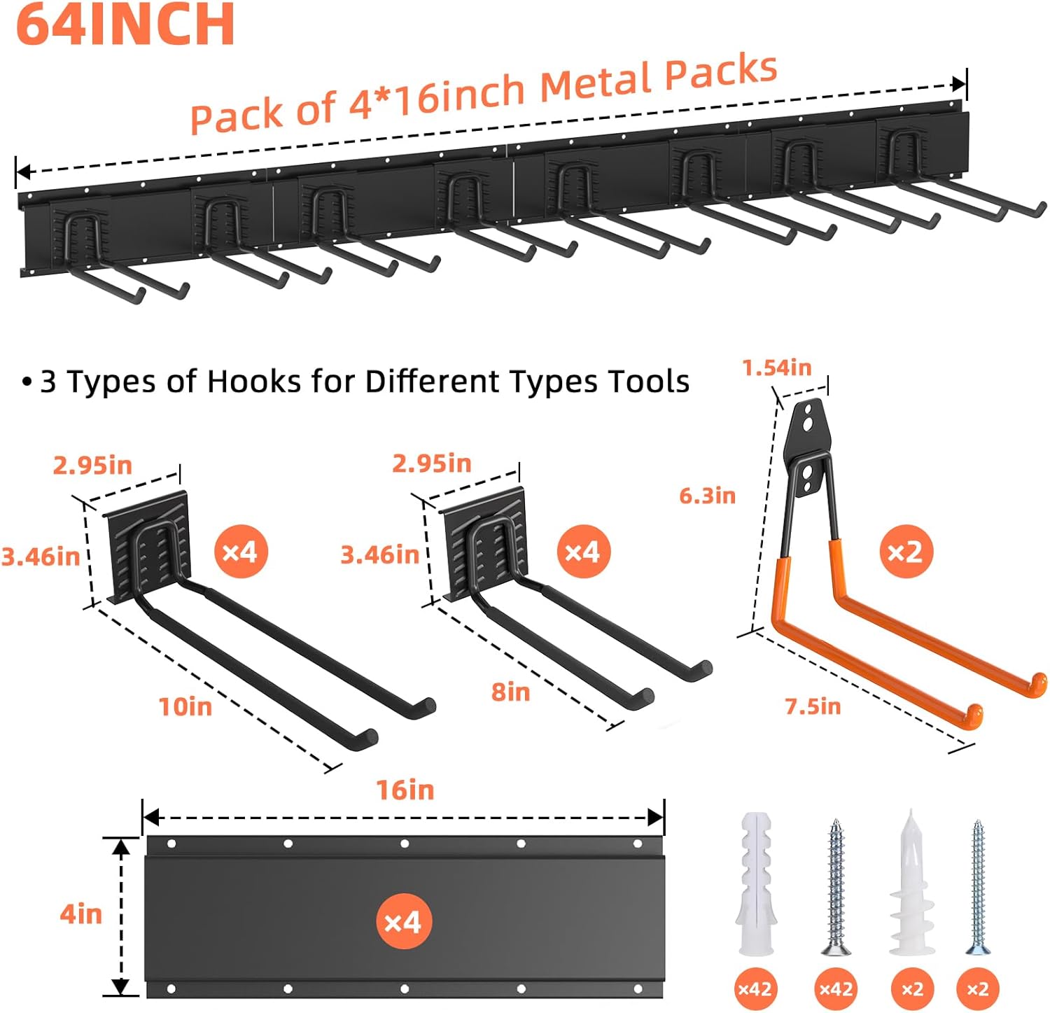 - [Package List]: The tool storage rack comes with 4 16-inch rails, 4 8-inch adjustable hooks, 4 10-inch adjustable hooks and 2 orange garage storage hooks, a set of mounting screws and anchors suitable for most walls and installation instructions