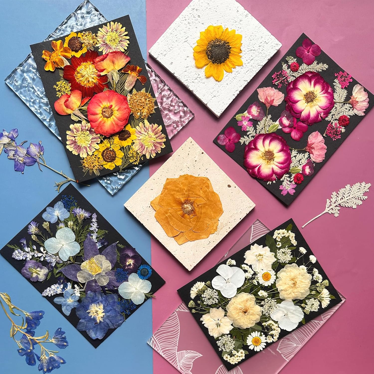 - Beautiful Natural Dried Flowers: Our pressed dried flowers made from real natural flowers and leaves, We use special techniques to keep the dried flowers bright and long-lasting in color. Please don't place the flowers in direct sunlight, and use up as soon as possible after opening, otherwise they will be oxidized and discolored by moisture absorption.