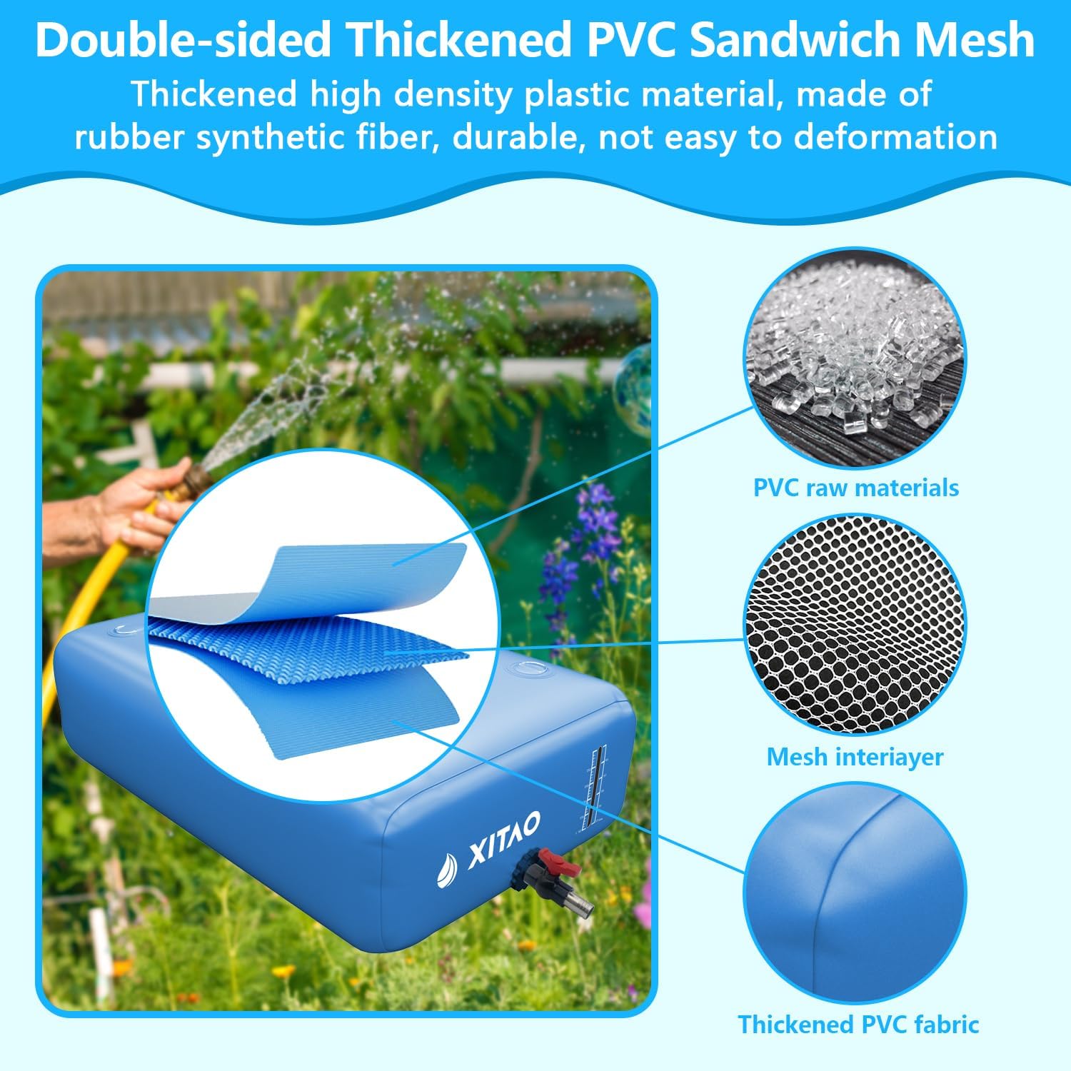 - 【Excellent Sealing】Our water storage bladder seams use high-temperature welding technology to withstand tremendous pressure without leaking. This improves the service life of the water bladder. Attached repair patches, when the water bladder is punctured by hard objects, the patches can easily repair the water bladder. Its reusable, simple frame assembly allows you to use it whenever you need our water barrel again.