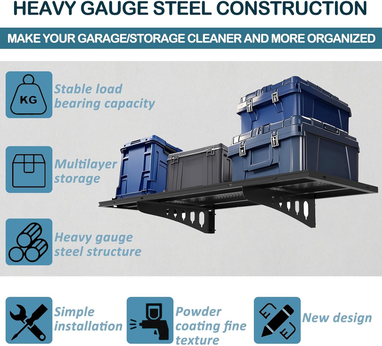 - Garage Shelf Tough Coating Defy Grease & Humidity:Rust-resistant powder coating withstands garage grease, road salt, and humid climates.Spill motor oil or antifreeze? Wipe clean instantly no stains, no corrosion, built for harsh garage environments.