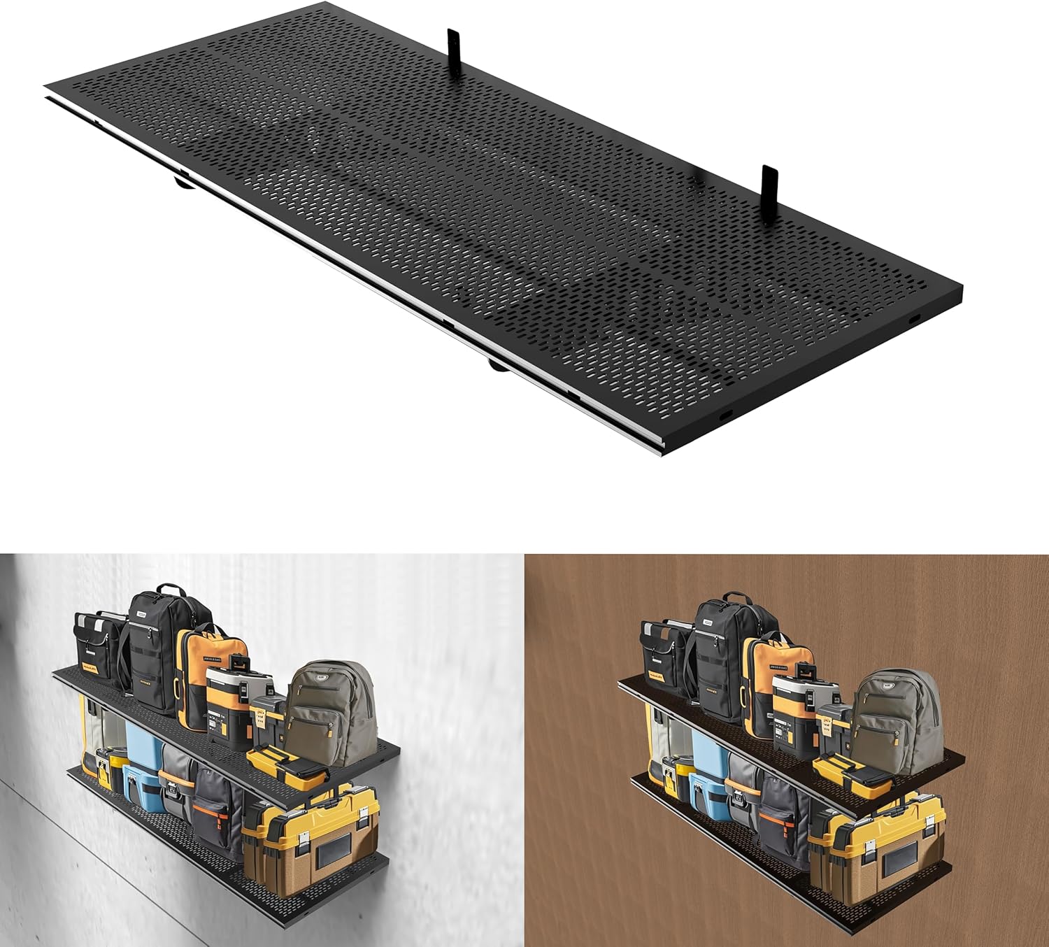 - Versatile Garage Wall Mounted Shelf System: Overhead bike storage: Hang bikes vertically with add-on hooks. Seasonal storage: Store holiday decorations or camping gear safely off the floor. Workbench companion: Keep wrenches, spray cans, and safety goggles within arm’s reach!