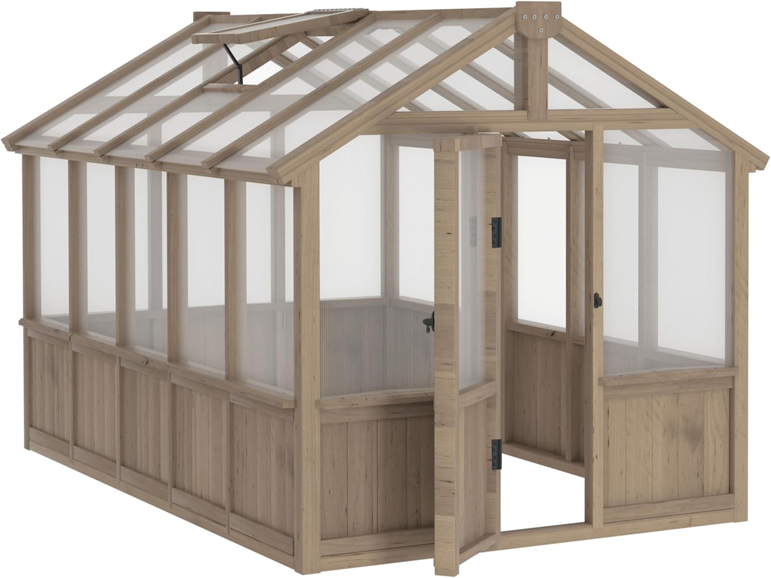 6x10 FT Green House for Outdoor, 6MM Thick Polycarbonate Panel Wooden Walk-in Greenhouse Kit with Lockable Door and Adjustable Roof Vent, Backyard Garden, Light Mocha Brown
