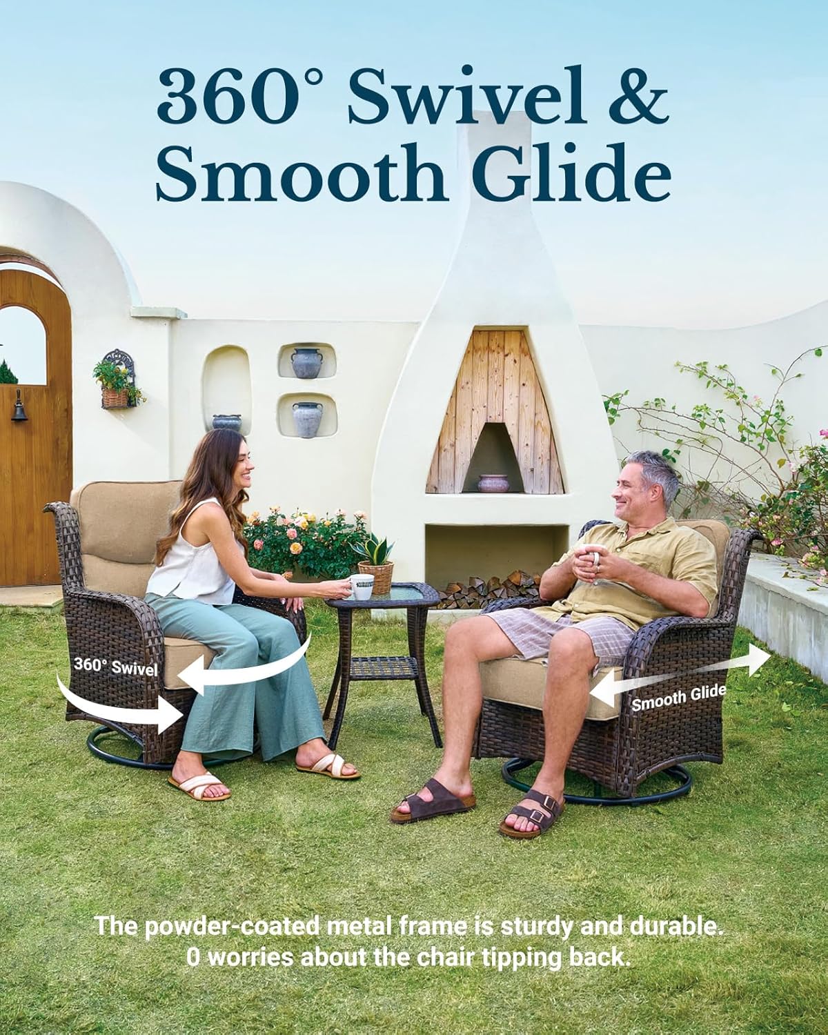 - Smooth 360° Swivel & Gentle Glide: Turn effortlessly to enjoy every view, then relax into a soothing back-and-forth motion—perfect for reading, napping, or sunset chats with friends