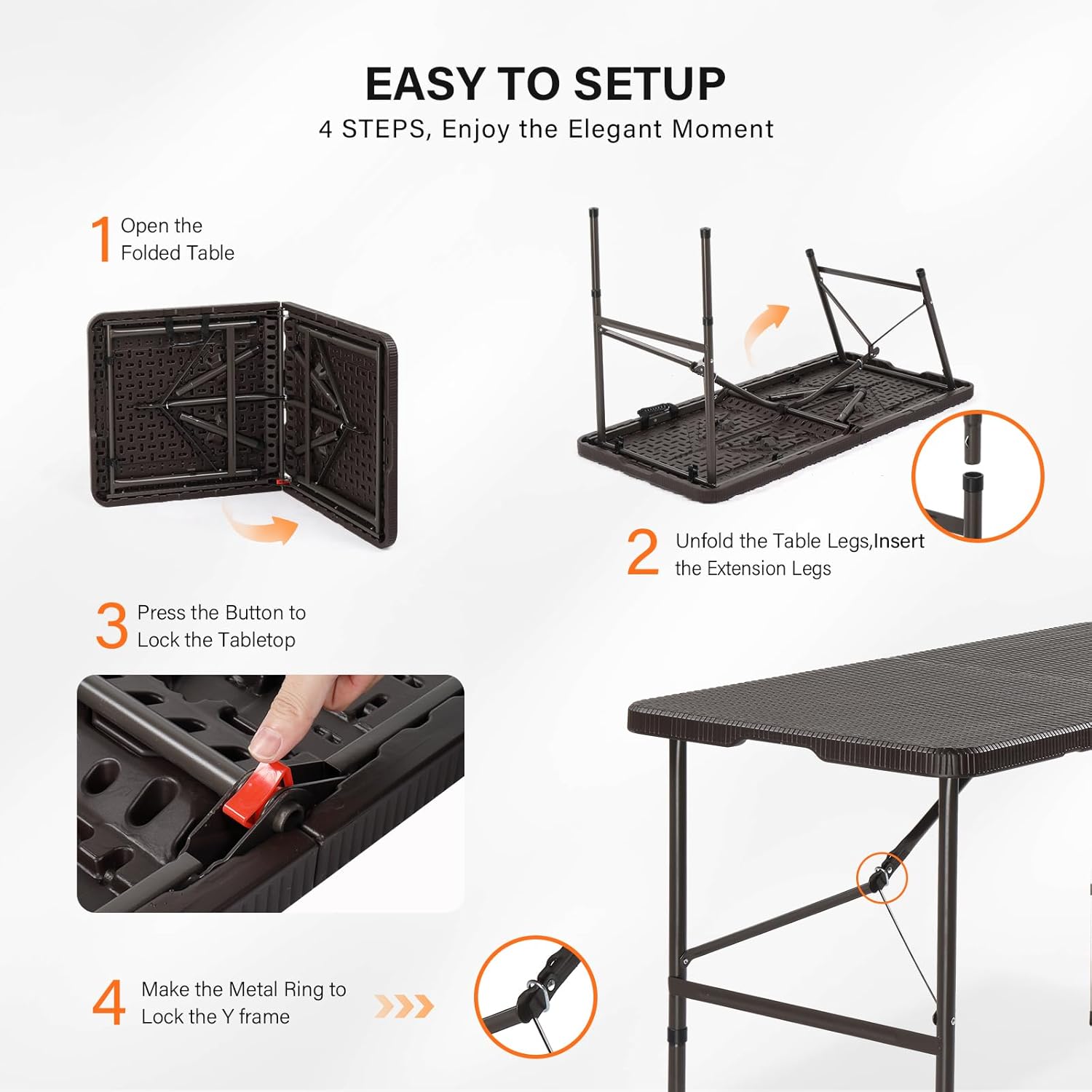 - Excellent Material -The tabletop is made of durable HDPE, the strong metal frame is with brown powder-coated. Perfect for outdoor and indoor activities