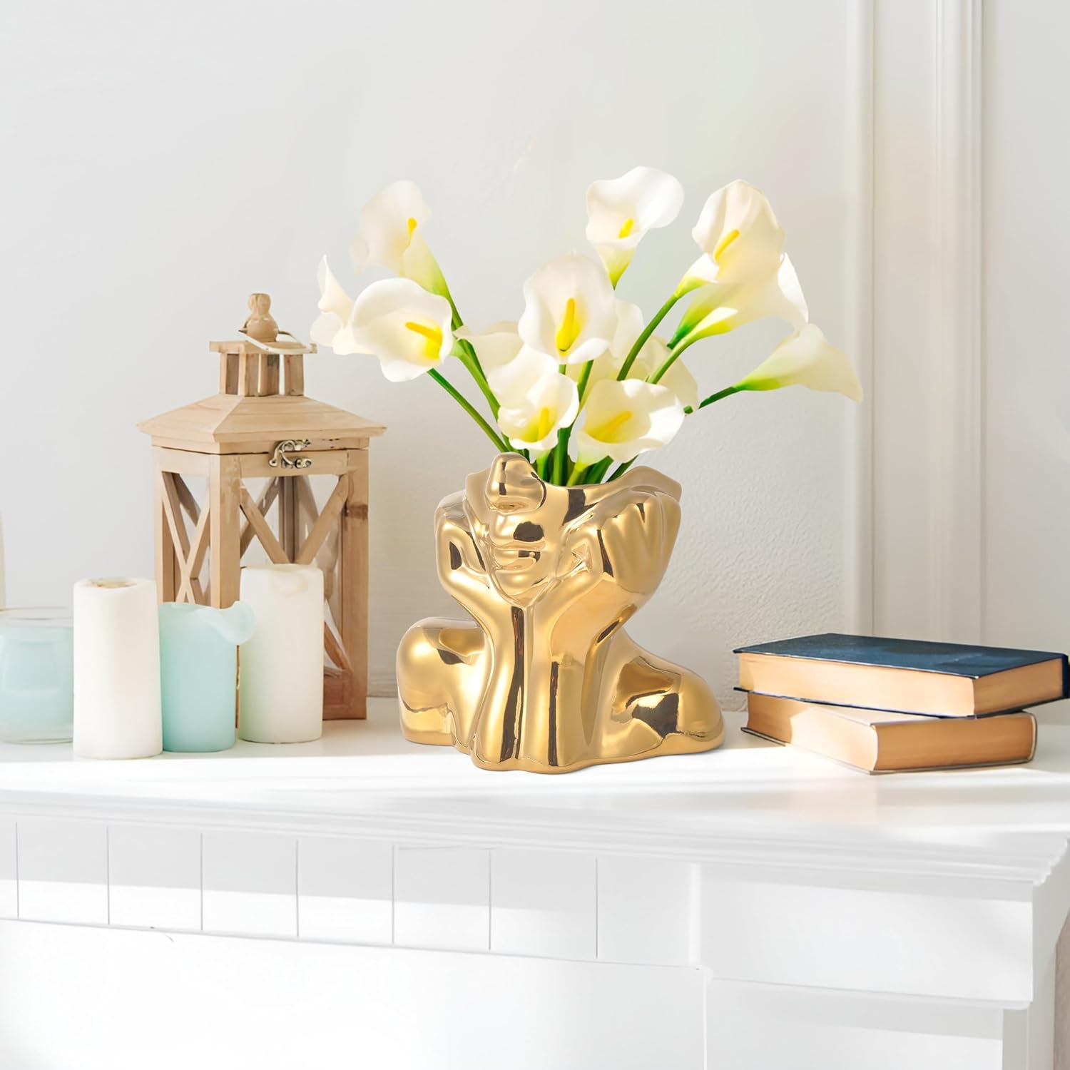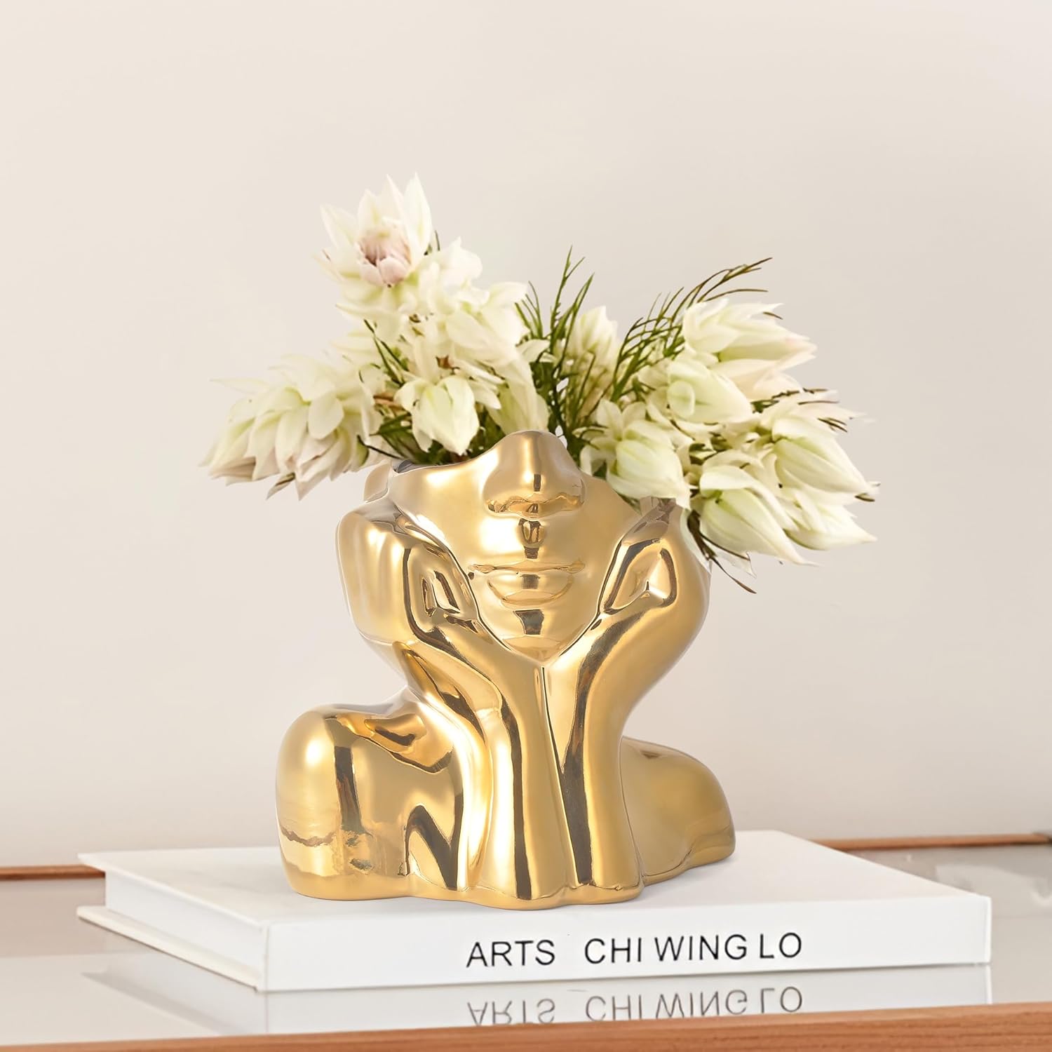 Gold Ceramic Human Face Decorative Vase - Shy Posture Modern Art Desktop Display for Bookshelf, Living Room, Office, Bedroom