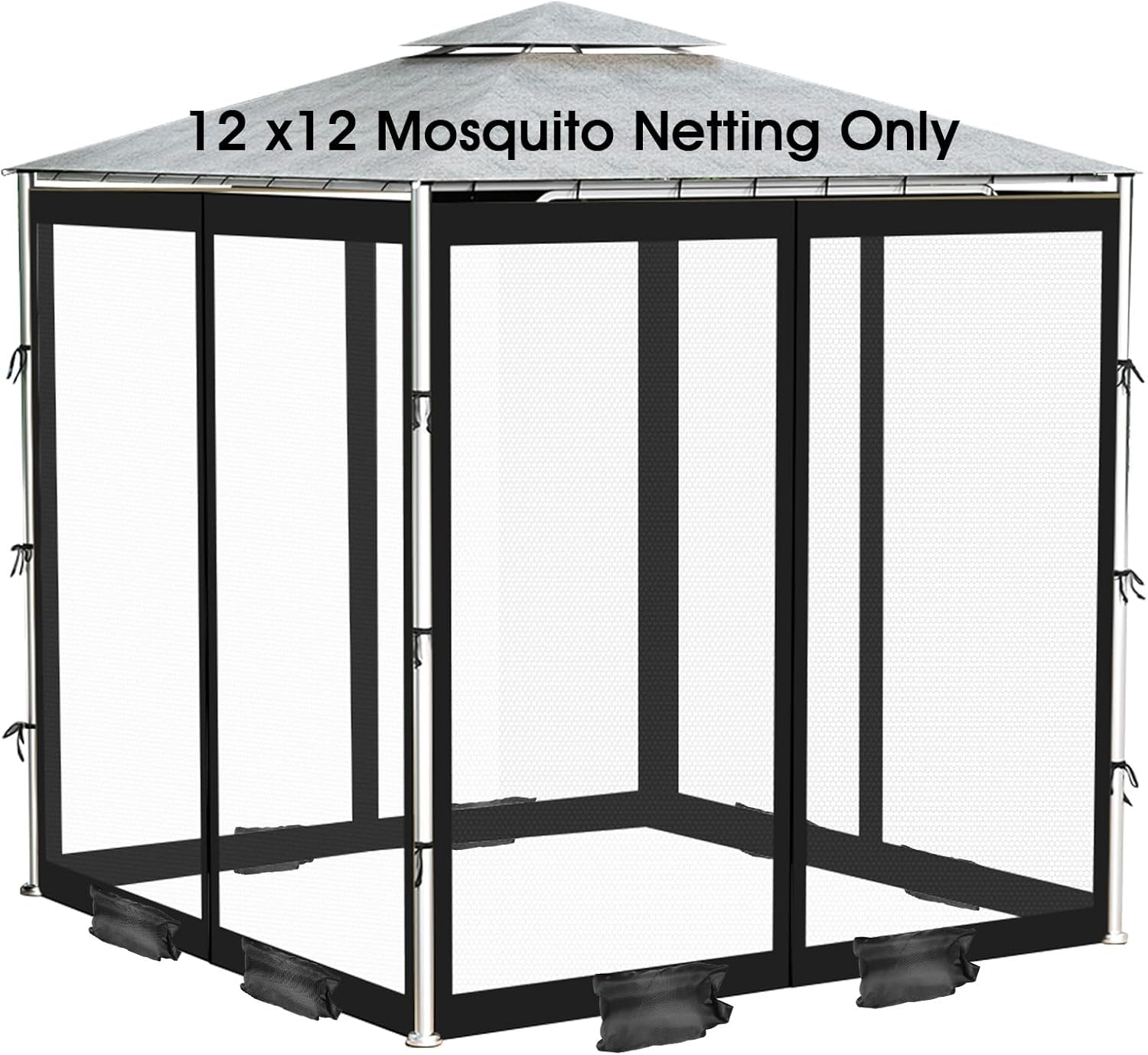 - đď¸ăPerfect Fit & Extra Stabilityă Fits 12x12ft Gazebos â Measures 12ft (L) x 12ft (W) x 7.2ft (H) with 4 zippered panels for full coverage. Includes 8 sandbags (competitors donât offer!) to prevent wind lift-offâno more flying mesh! Always measure your gazebo before purchase.