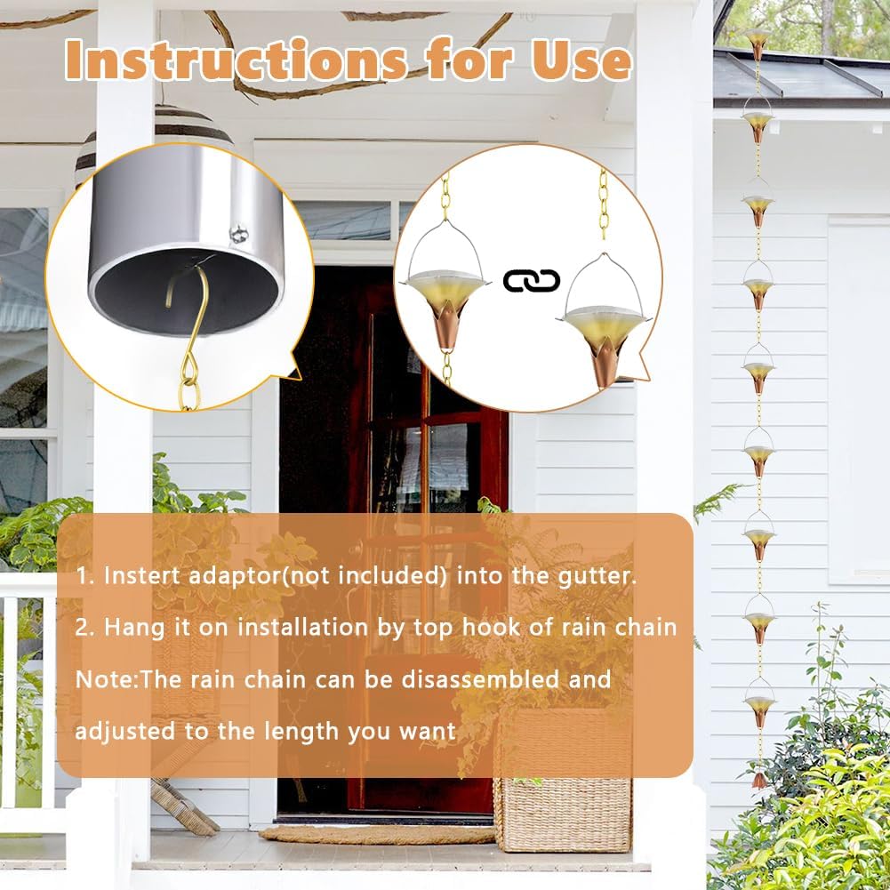 - Warm Tips: Each cup of the rain chain is designed with a wide upper and a lower narrow, effectively capturing most of the rainwater, but some splashes will occur. If you encounter other problems, please inform us through Amazon, and we will provide you with a solution to the problem within 24 hours