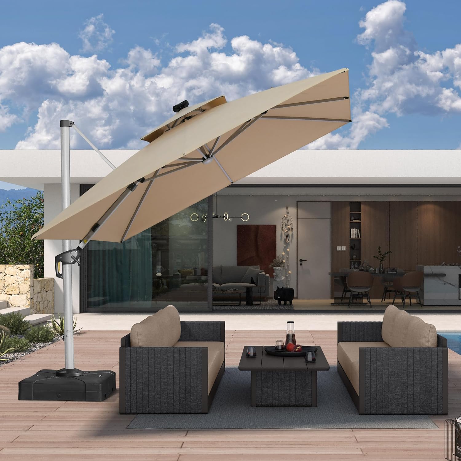 PURPLE LEAF 10' X 10' Solar Powered LED Patio Large Umbrella Offset Double Top Hanging Umbrella Outdoor Market Umbrella for Garden, Deep Beige