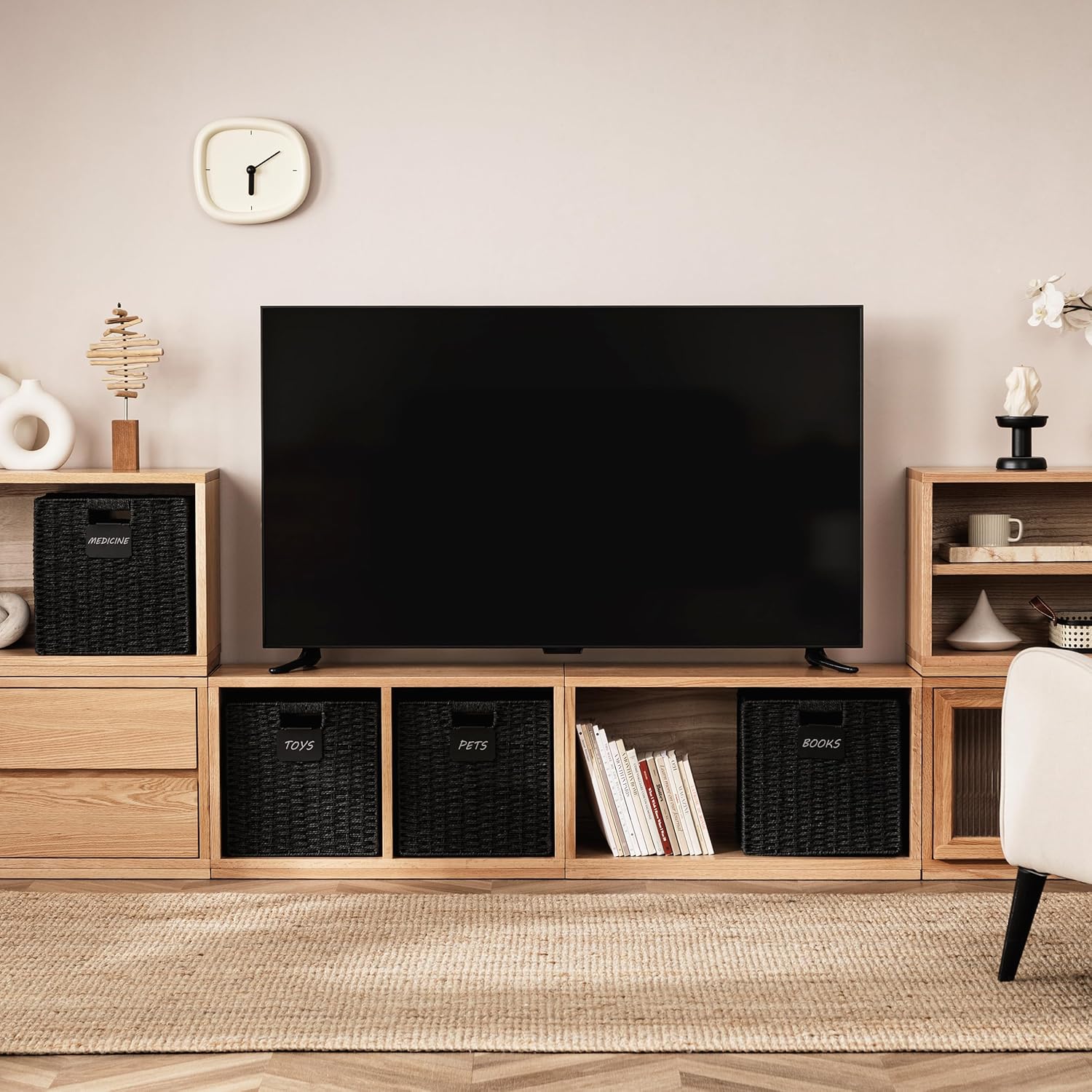 UBBCARE 4 Pack Wicker Basket, 12×12 Storage Cubes with Label, Foldable Cube Storage Bin with Handle, Square Storage Basket for Shelves, Woven Paper Rope Basket for Organizing, Black
