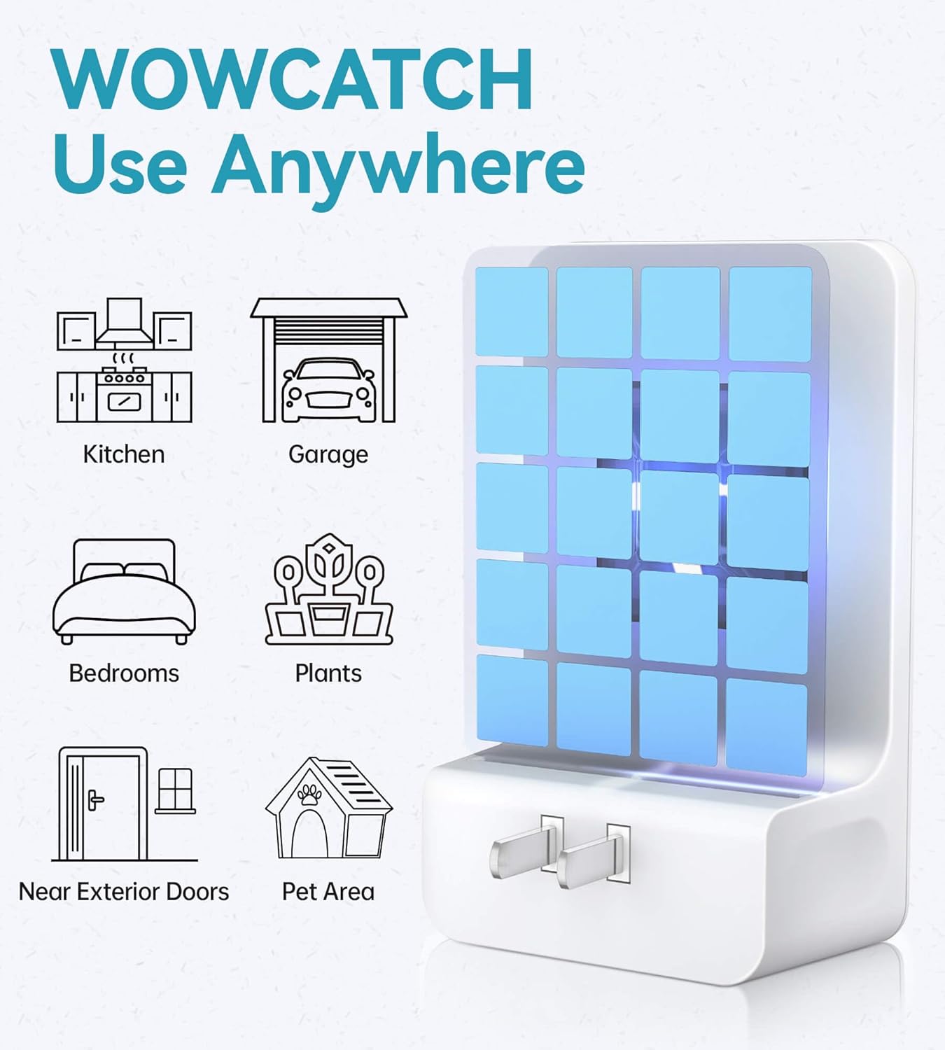 - [Highly Effective Indoor Fly Trap for Home] The WowCatch flying insect trap uses advanced Dual-UV Light technology, emitting light in five directions to effectively attract a variety of flying pests, such as mosquitoes, gnats, fruit flies, house flies, moths, and more.