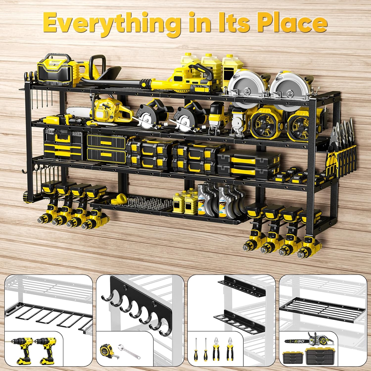 64”W Power Tool Organizer Wall Mount, Heavy Duty 8-Drill Cordless Drill Holder Supports 800 lbs, 4-Layer Corner or Straight Assembly Large Tool Battery Storage Rack for Garage Workshop