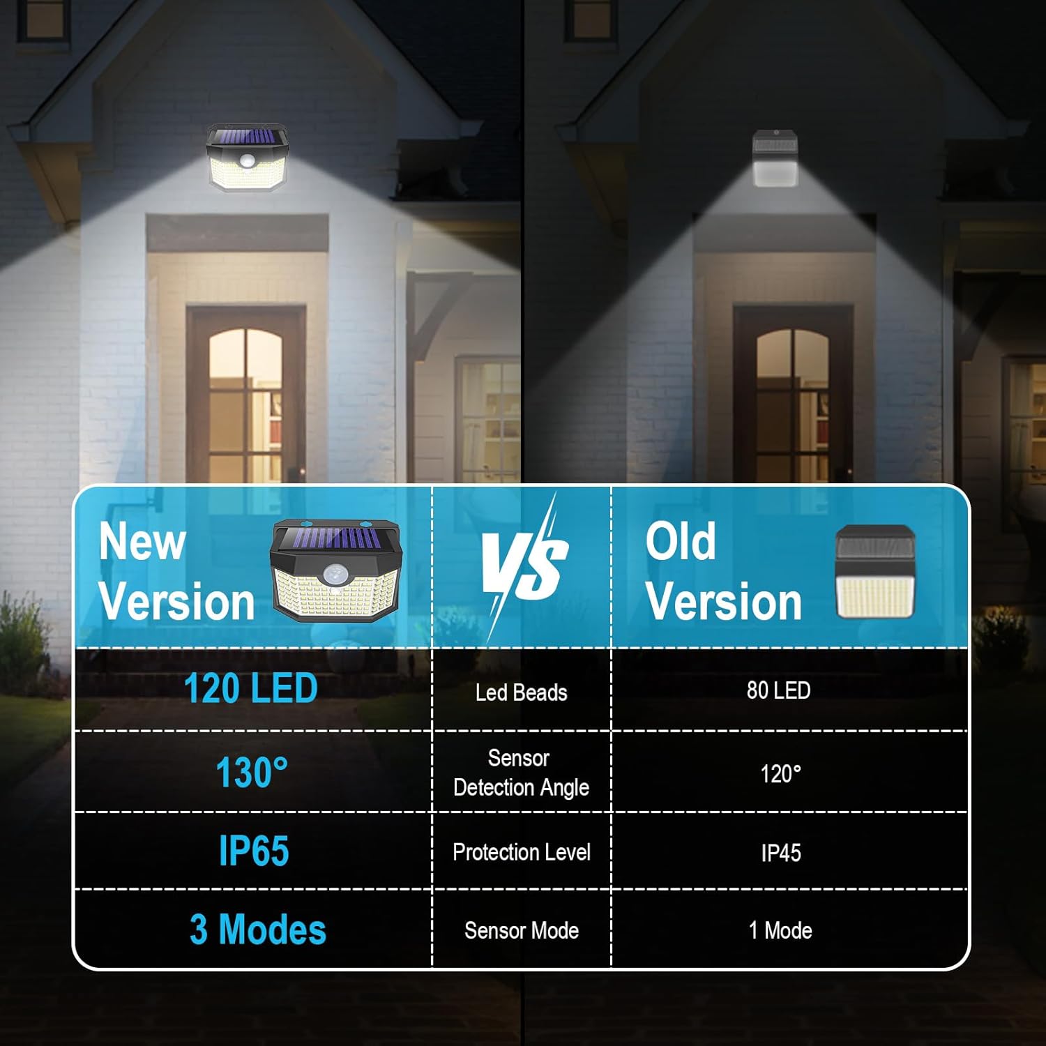- 【3 Optional Lighting Modes】The upgraded outdoor lights have 3 working modes to select: 1. Strong light sensor mode(Light is off when no movement,full bright for 25-30s when movement is detected) 2. Nomal light mode(Always Medium light for 8h) 3. Dim light sensor mode(Medium light when no movement, full bright for 25-30s when movement is detected).