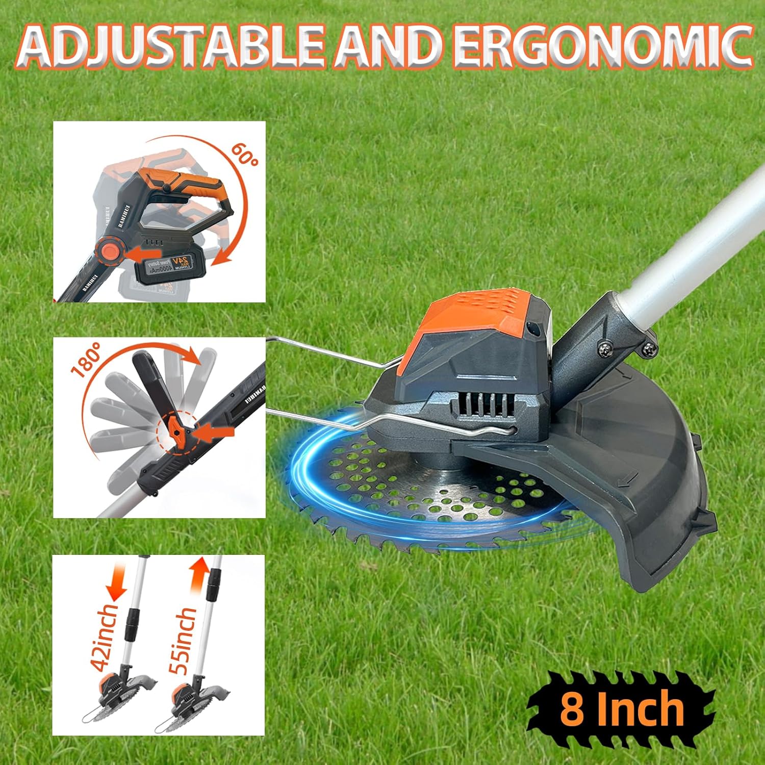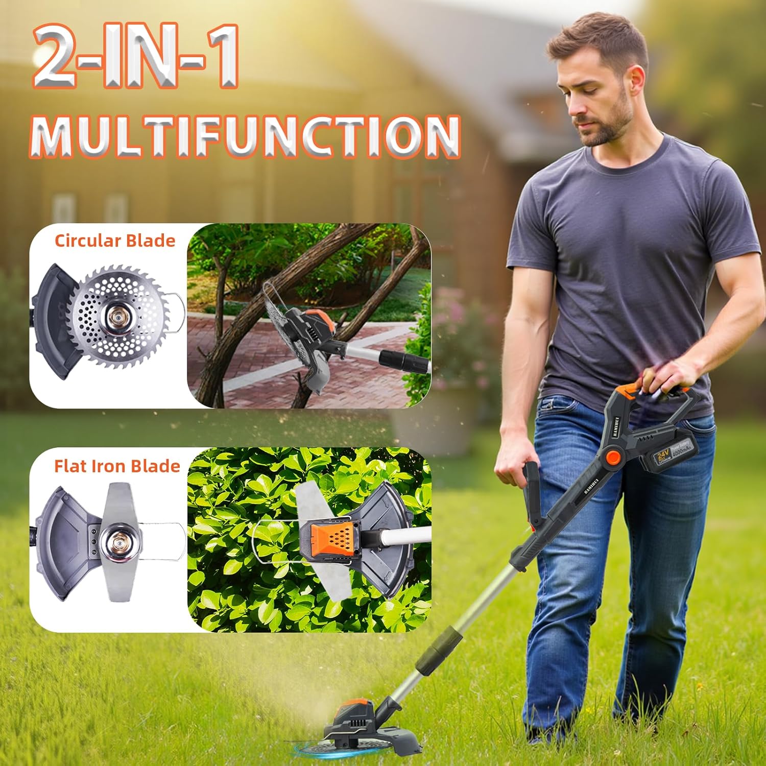 - 【⚡2-in-1 Battery Powered Weed Wacker】2×8" Circular Saw Blades: Cuts through thick branches and dense bushes like butter. ✂️2×9" Stainless Steel Blades: Perfect for weeds, reeds, and overgrown grass. One electric grass trimmer for ALL your lawn, garden, and landscaping needs!
