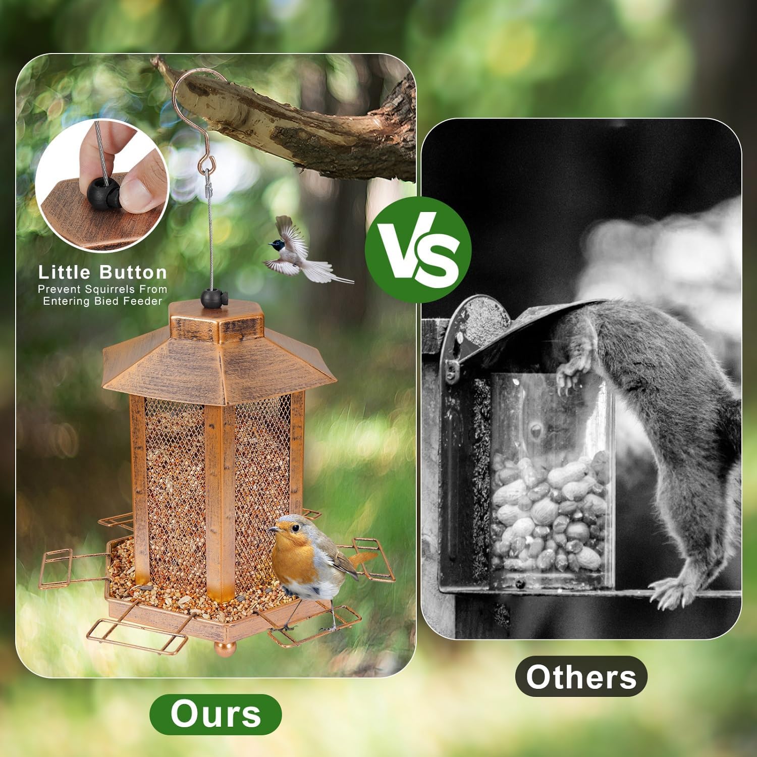 - SQUIRREL-PROOF & WEATHER-RESISTANT Unlike flimsy plastic feeders, the DTEPFUEN bird feeder is made of heavy-duty metal to withstand squirrel damage and harsh weather. The metal roof and perches prevent squirrels from chewing through, while the powder-coated finish resists rust, ensuring long-lasting use outdoors.