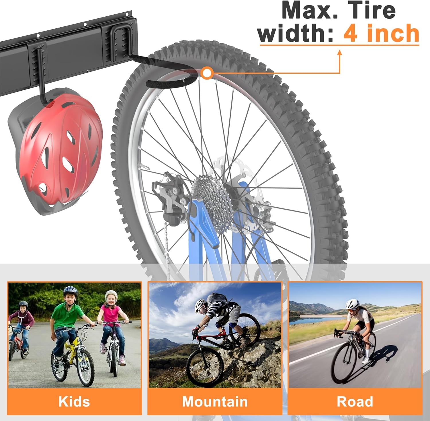 - Fits Most Bike Types: Designed to hold road bikes, mountain bikes, kids’ bikes, and more. Each hook supports up to 50 lbs and fits tires up to 4 inches wide, making it ideal for a variety of bicycles