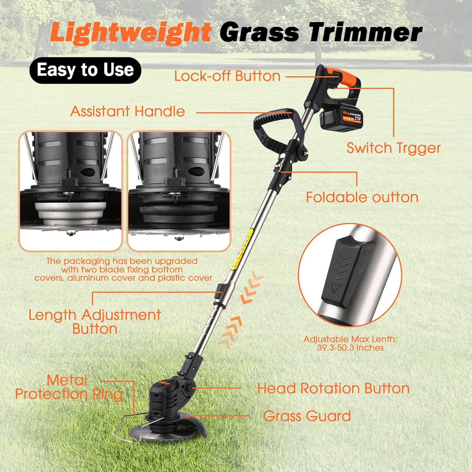 - Lightweight & Safe Design for All Users: This portable weed eater is easy to handle for everyone, from elderly users to those with limited strength. The ergonomic design on cordless weed wacker ensures comfort during prolonged use, and the built-in safety lock prevents accidental activation, while the grass baffle keeps debris under control.