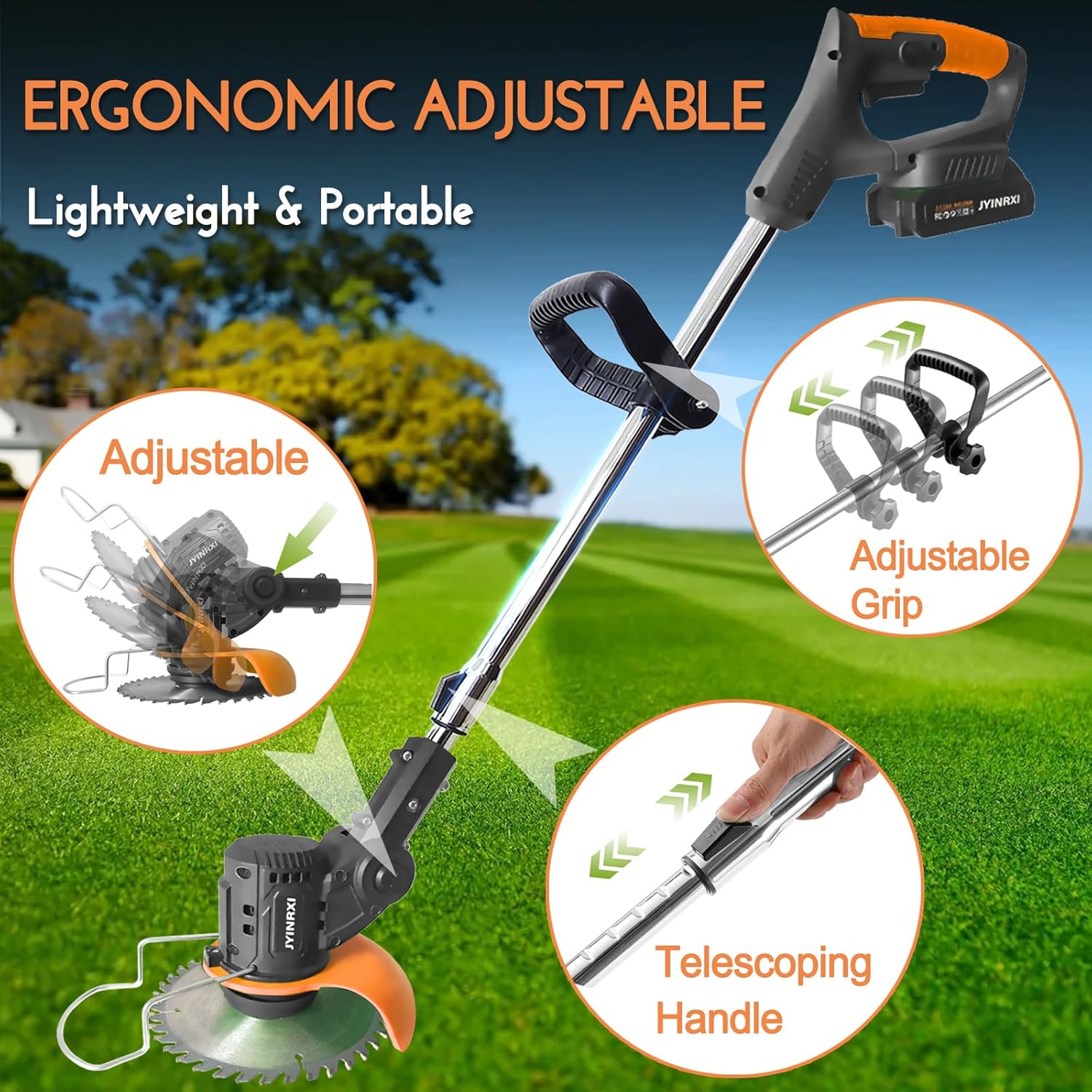 - Multiple Adjustment for Use:The weed trimmer eater battery powered length can be adjusted from 33" to 47", to provide the length required by each individual. The battery powered weed wacker Angle of the head can be adjusted from 0-90°,Easily adjust to different heights and angles to tackle hard-to-reach areas, making it ideal for trimming uneven terrain, sidewalks, courtyards, and garden beds.