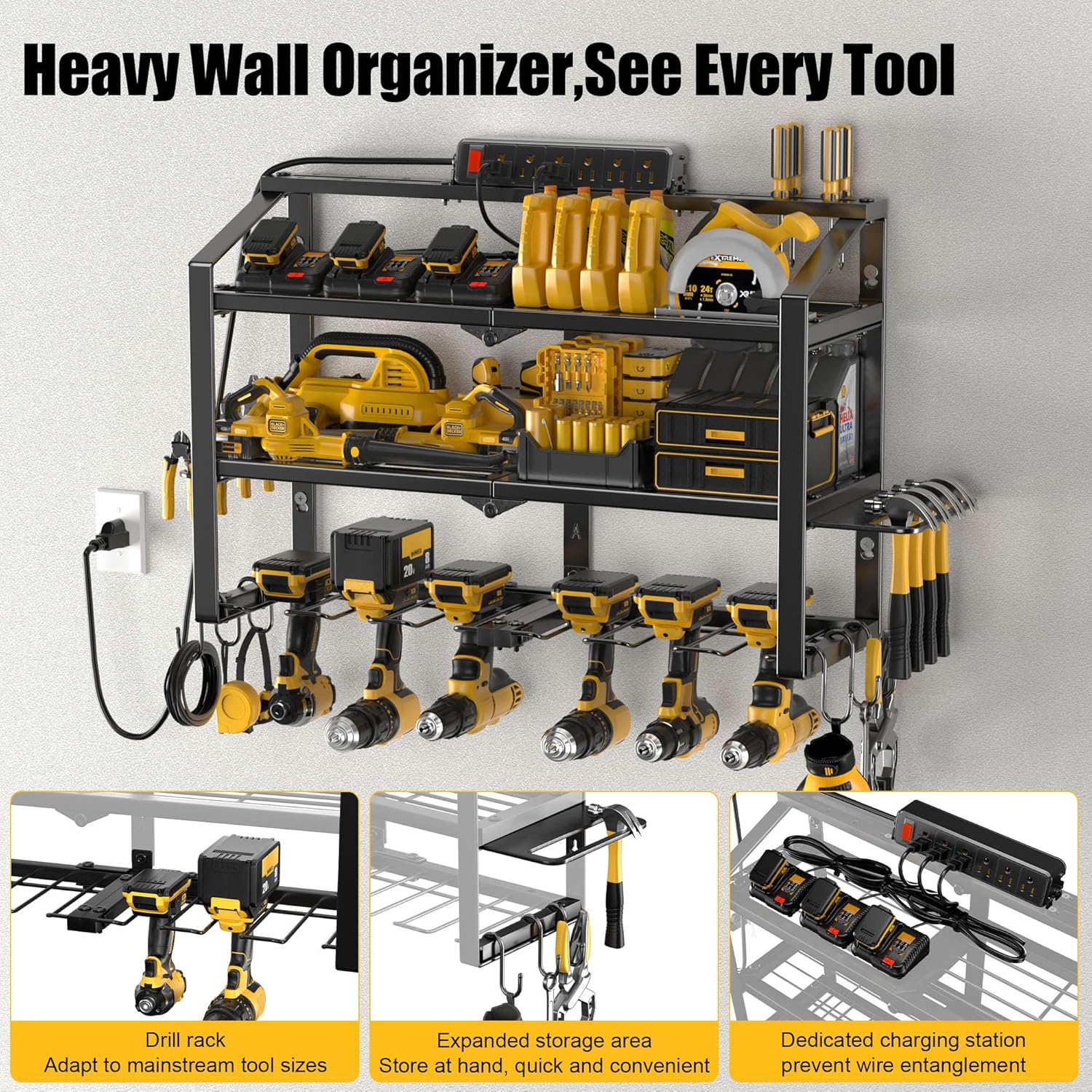 Heavy Duty Power Tool Organizer Wall Mount, 3 Layers Storage Rack with 6 Cordless Drill Holders, Garage Tool Organizer Storage for Workshop Shed, Charging Station Shelf, Father/Men Gifts