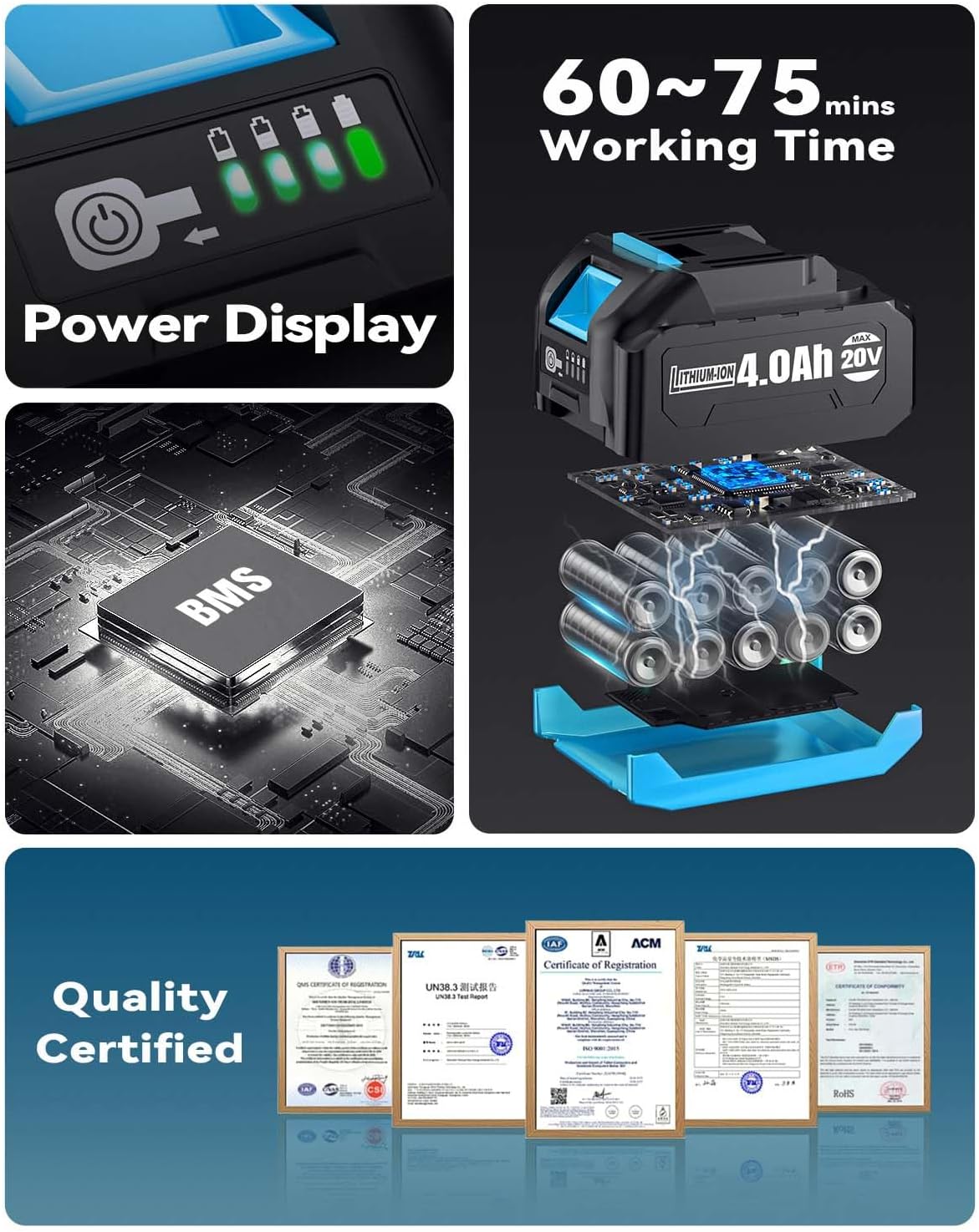 - [Dependable Performance] The motor speed is 11,000 RPM, 40% higher than the average. Professionally certified battery supports actual work for 75-100 mins