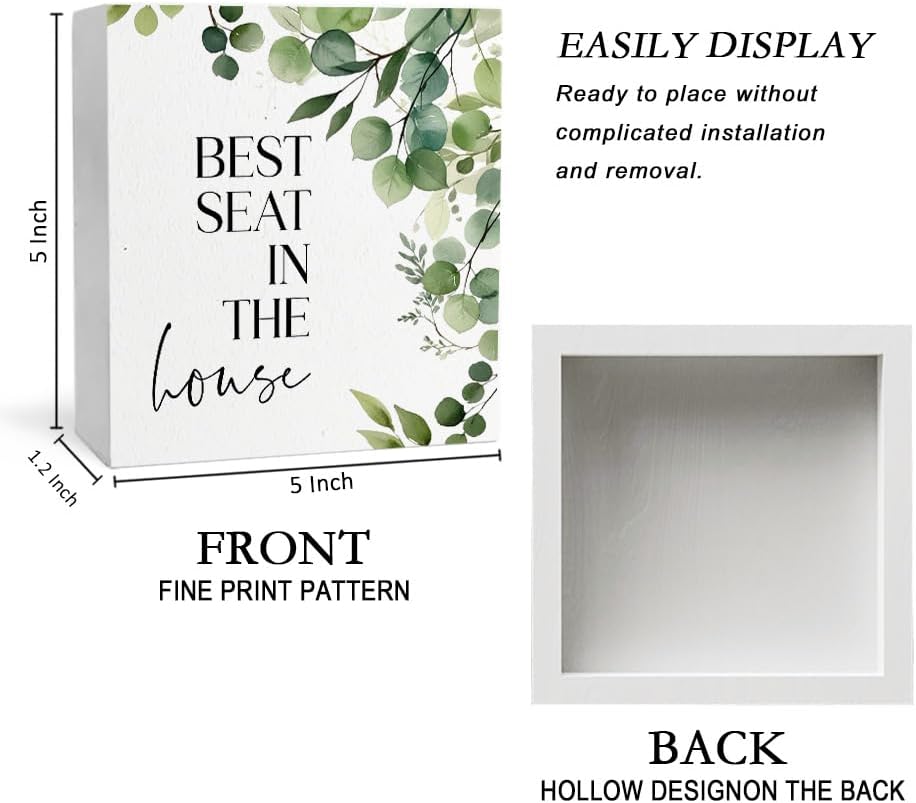 Funny Bathroom Signs, Best Seat in the House Wooden Box Sign, Eucalyptus Botanical Wood Signs Plaque for Restroom Washroom Toilet Counter Shelf Table Decor, 5x5 Inch