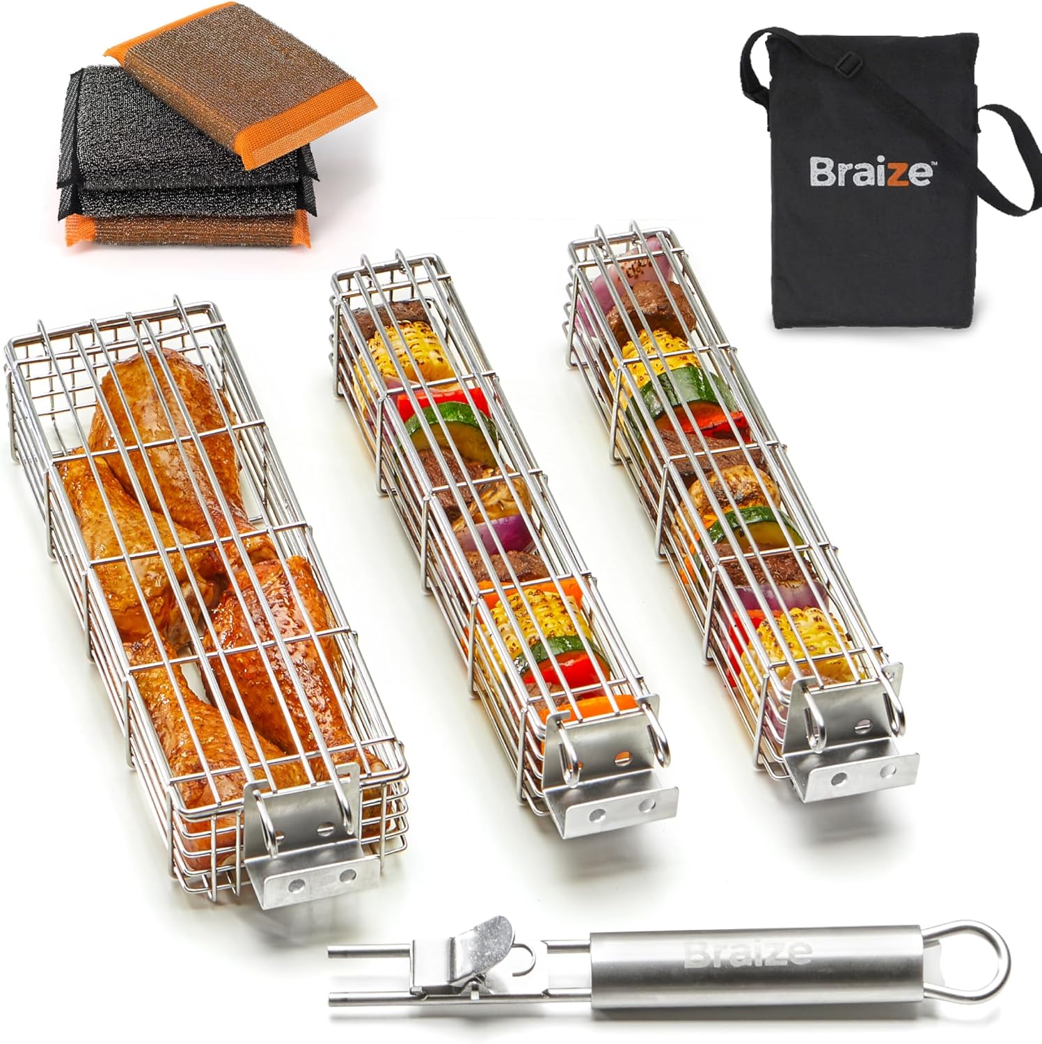 Large Grilling Basket Set – 3 Stainless Steel Kabob Baskets with Removable Handle & Scrubber Sponge – Heavy-Duty Grill Accessory for Veggies, Meat & More