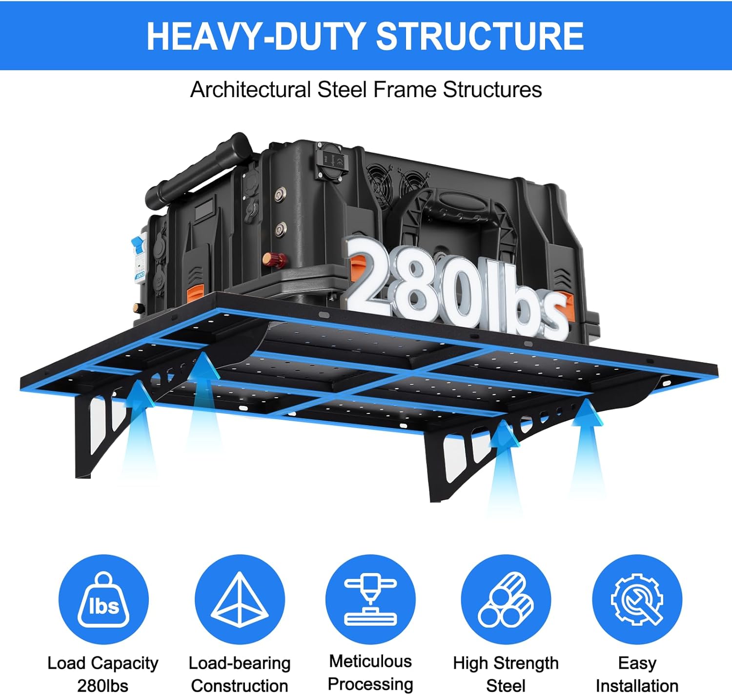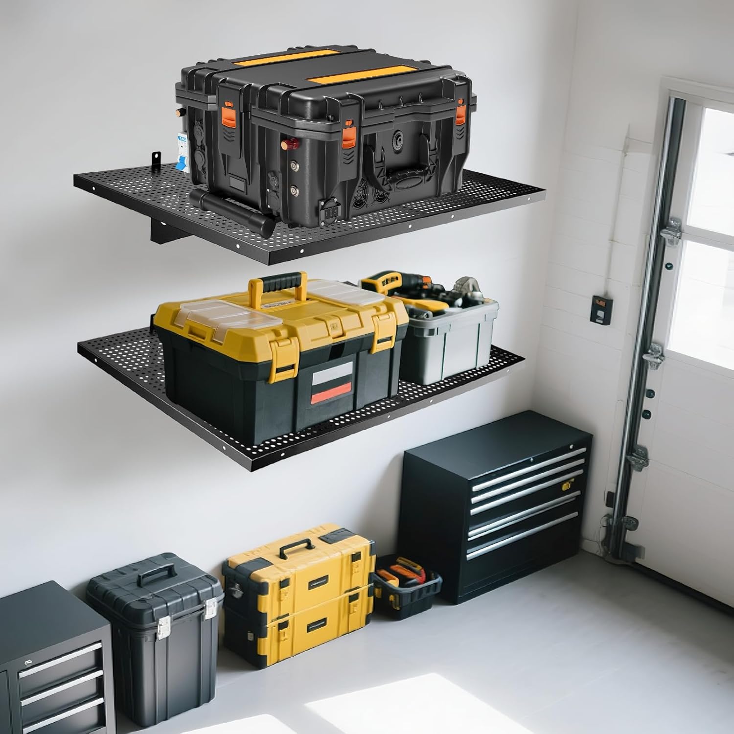 - ăHEAVY DUTY CONSTRUCTIONăGarage wall shelving takes its cues from architectural frame construction, with a 2x3 ft individual bracket load capacity of 280 lbs. and a total of 560 lbs. 2 shelves which makes it easy to store most of the items in your garage.