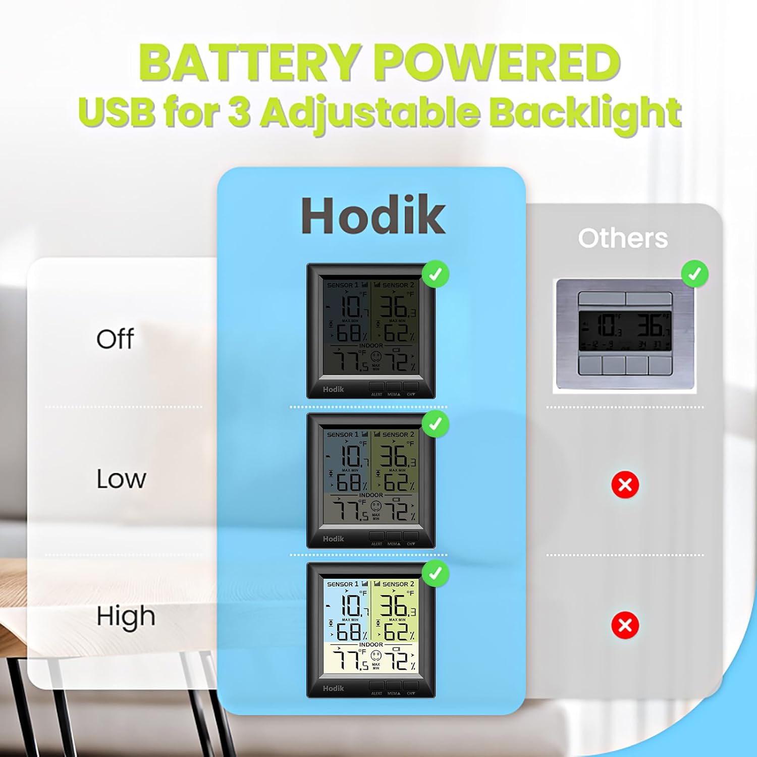 - ăFunctionsă: The display of the rv refrigerator thermometer is in several colors and the numbers are big enough for you to see them from the side of the room. Our deep freezer thermometer with alarm provides real-time temp humidity readings. You can also see the comfort index, 24-hour MAX/MIN record and temp humidity trend arrows on the display.