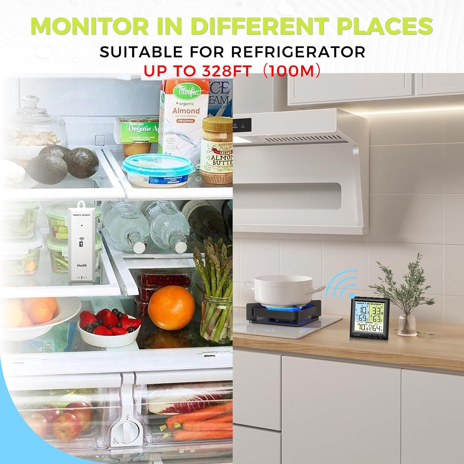 - ăRefrigerator Freezer Thermometer with Alarm, Widely Usedă: With 330FT/100M Monitoring Range, it can be used in the FRIDGE and FREEZER, anywhere you want. Advanced wireless patented technology enables more stable and reliable data transmission, updated data every 30s.