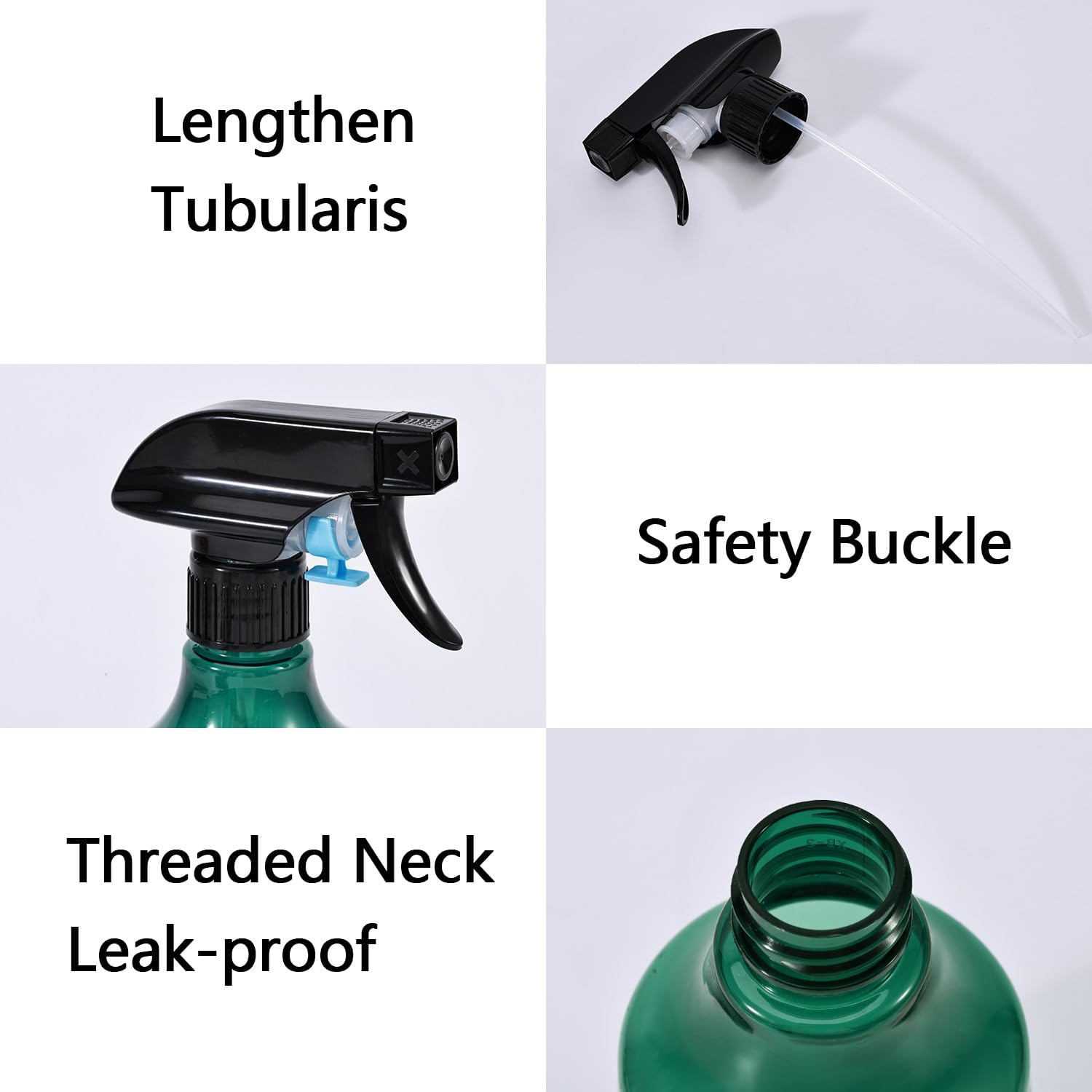 - FEATURES: Transparent , you can see how many liquid left clearly; safety buck and threaded neck prevents liquid from leaking efficiently; fine and homogeneous mist