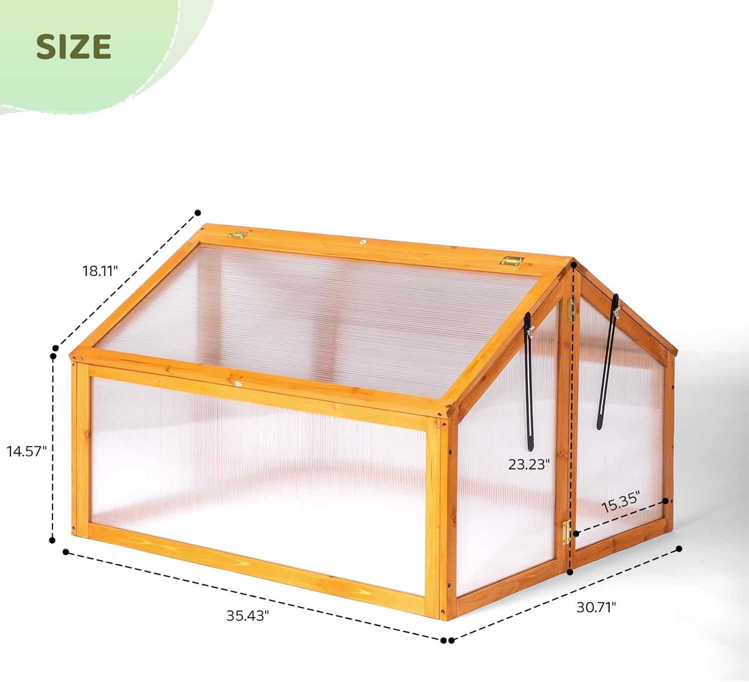 VINGLI Cold Frame Greenhouse, Mini Wooden Green House with Flip-Top Roof, Raised Flower Planter Shelf, Small Lockable Wood Cabinet for Plants Indoor Outdoor (Yellow, 35.43" x 30.71" x 23.23")